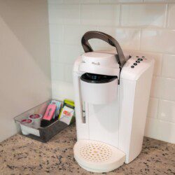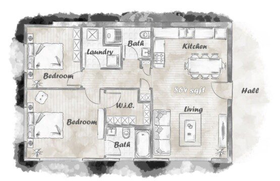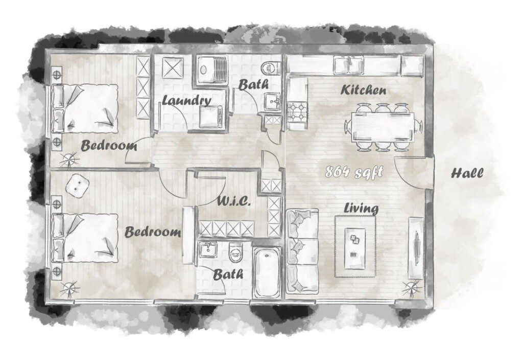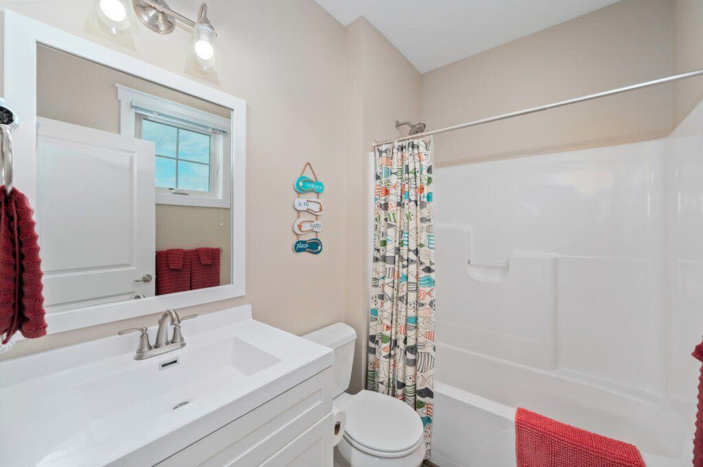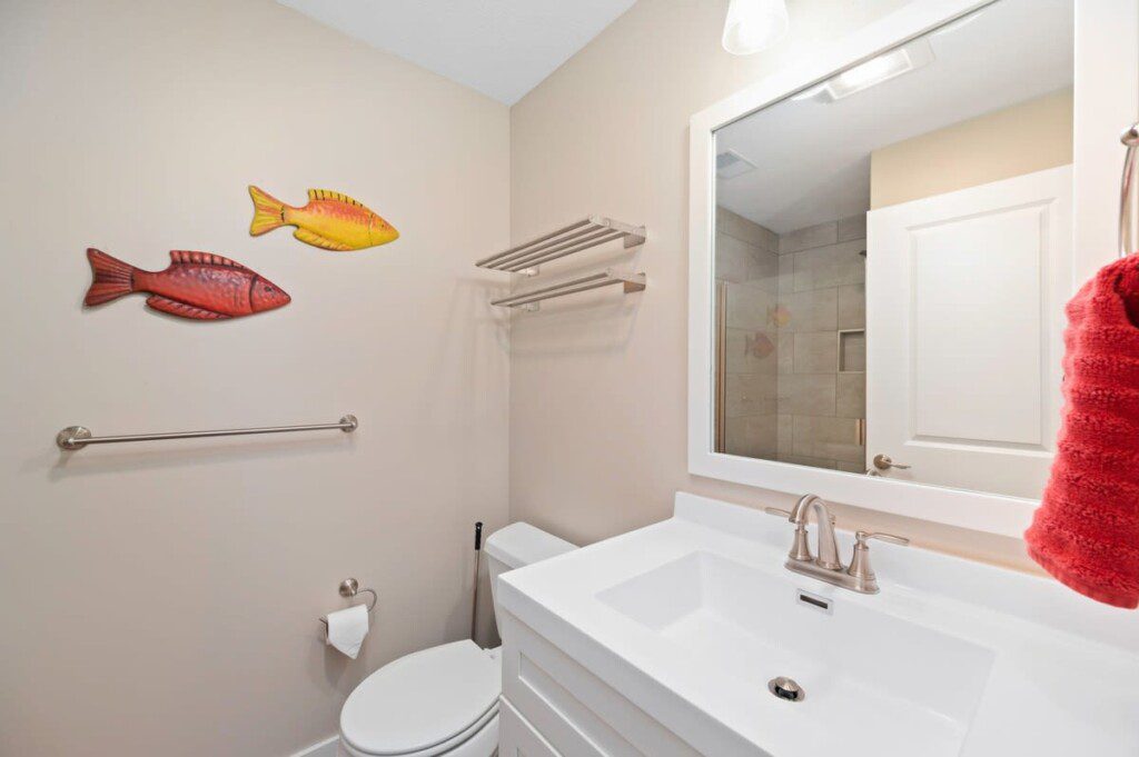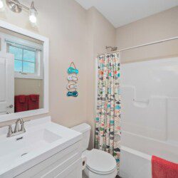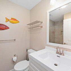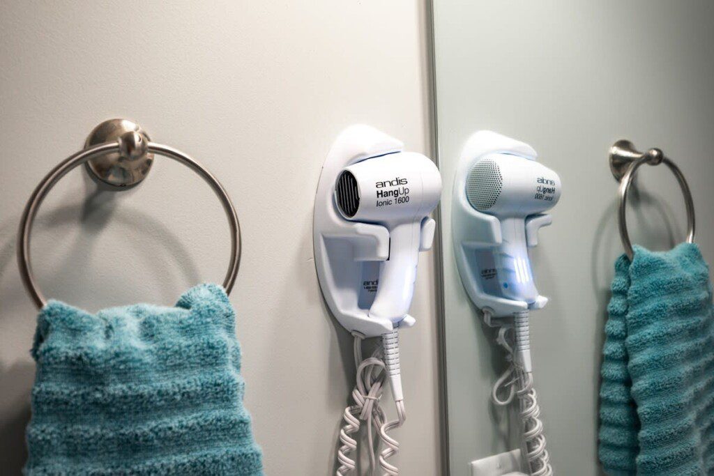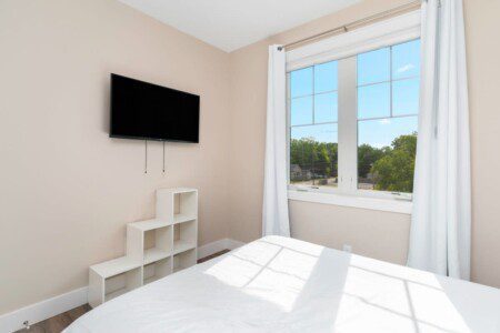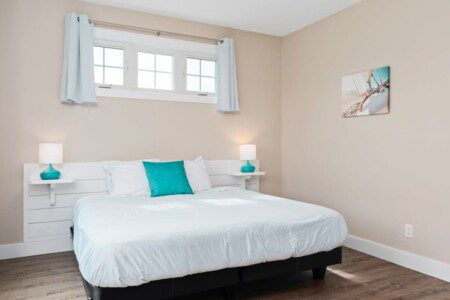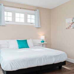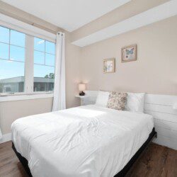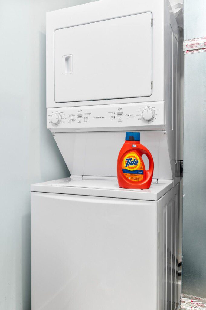 Walk into our master bedroom that has a king size bed, flat screen tv, and a walk in closet to fit all of your belongings (or new purchases). The master bedroom also has an ensuite bathroom, stocked with toiletry essentials. The guest bedroom has a queen bed along with a flat screen tv. Don’t worry if you decide to extend your stay, each unit comes with their own washer and dryer along with basic laundry supplies.