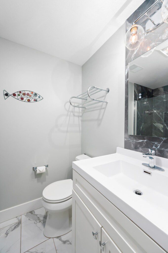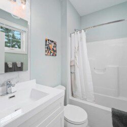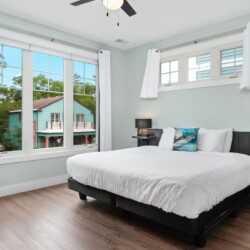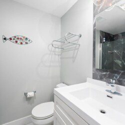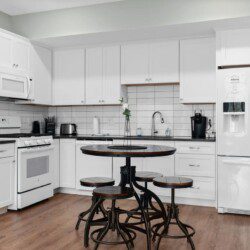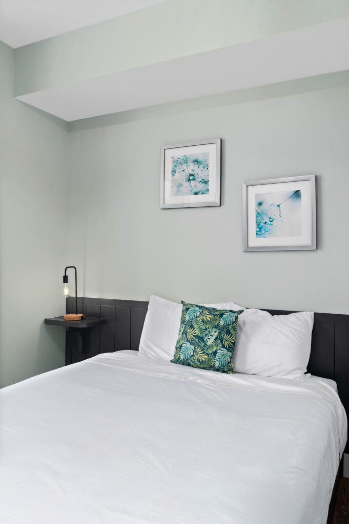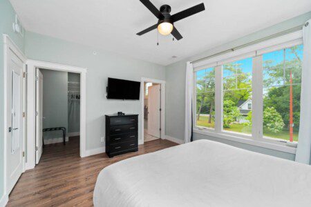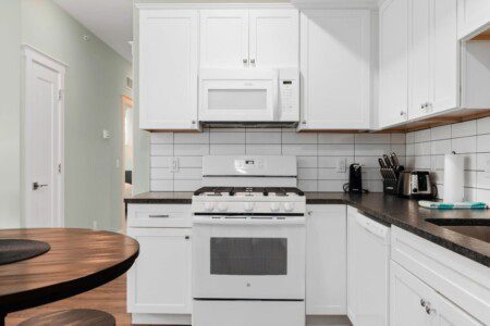 Walk into our master bedroom that has a king size bed, flat screen tv, and a spacious walk in closet to fit all of your belongings (or new purchases). The master bedroom also has an ensuite bathroom, stocked with toiletry essentials. The guest bedroom has a queen bed along with a flat screen tv and a dresser to store your belongings. Don’t worry if you decide to extend your stay, each unit comes with their own washer and dryer along with basic laundry supplies.