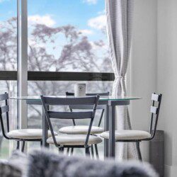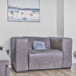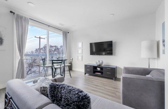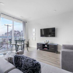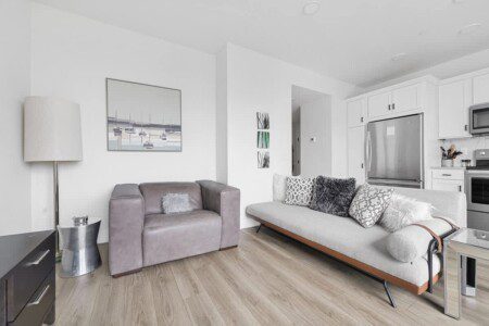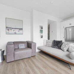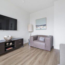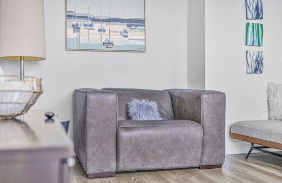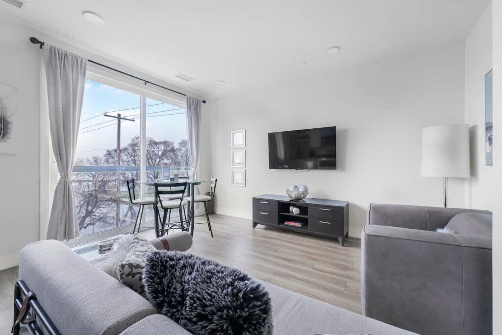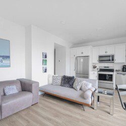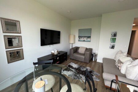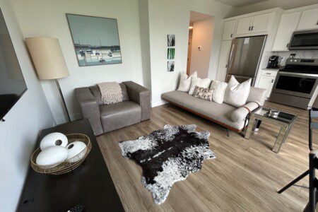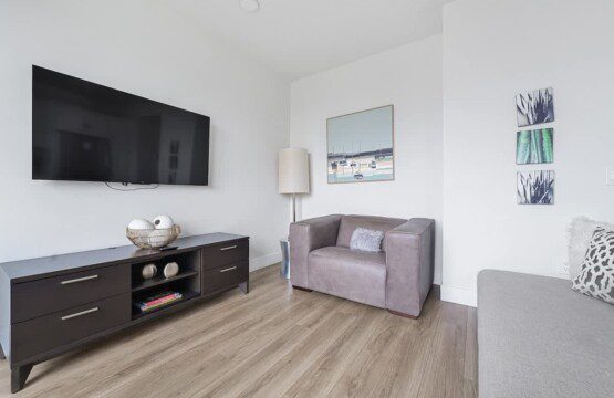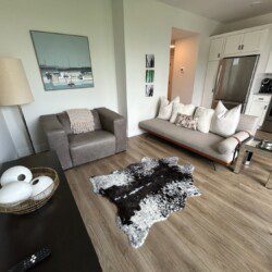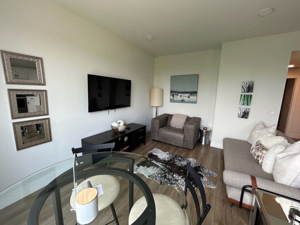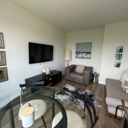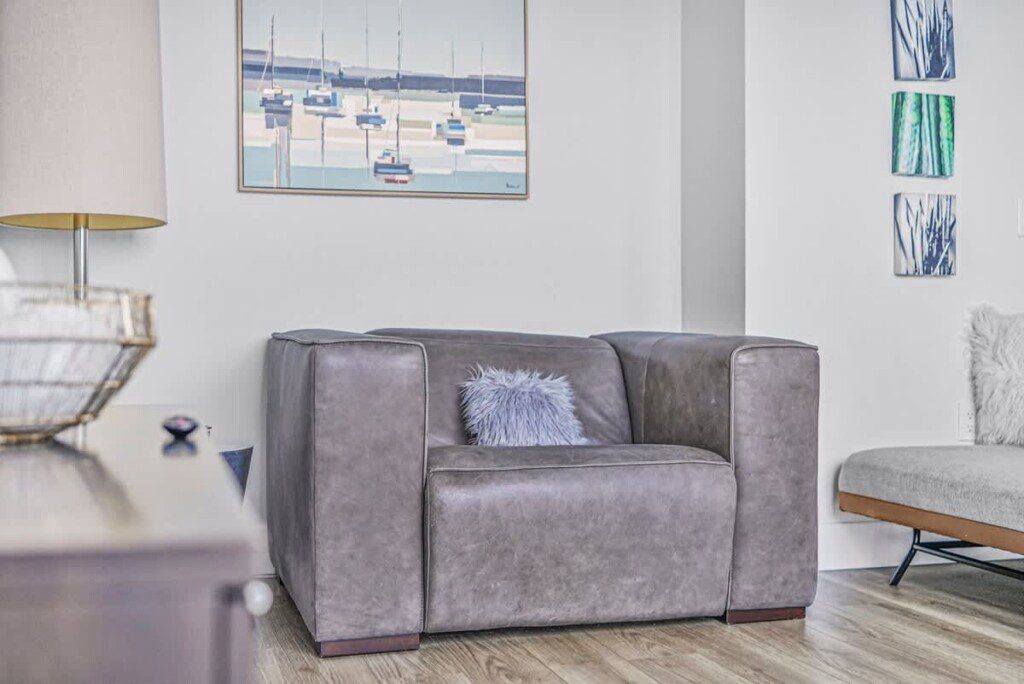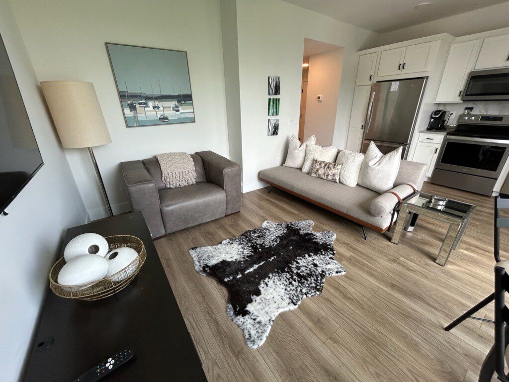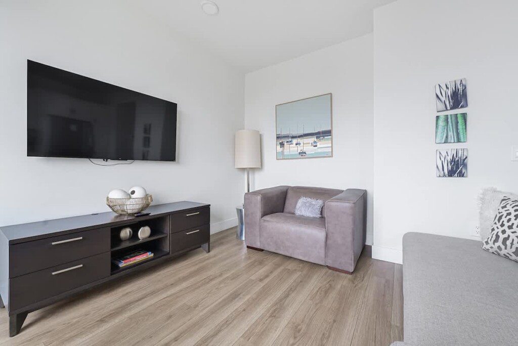 The spacious living room features a couch, chair, and has a large smart TV. This condos modern feel makes it the perfect place to gather after a long day of exploring!