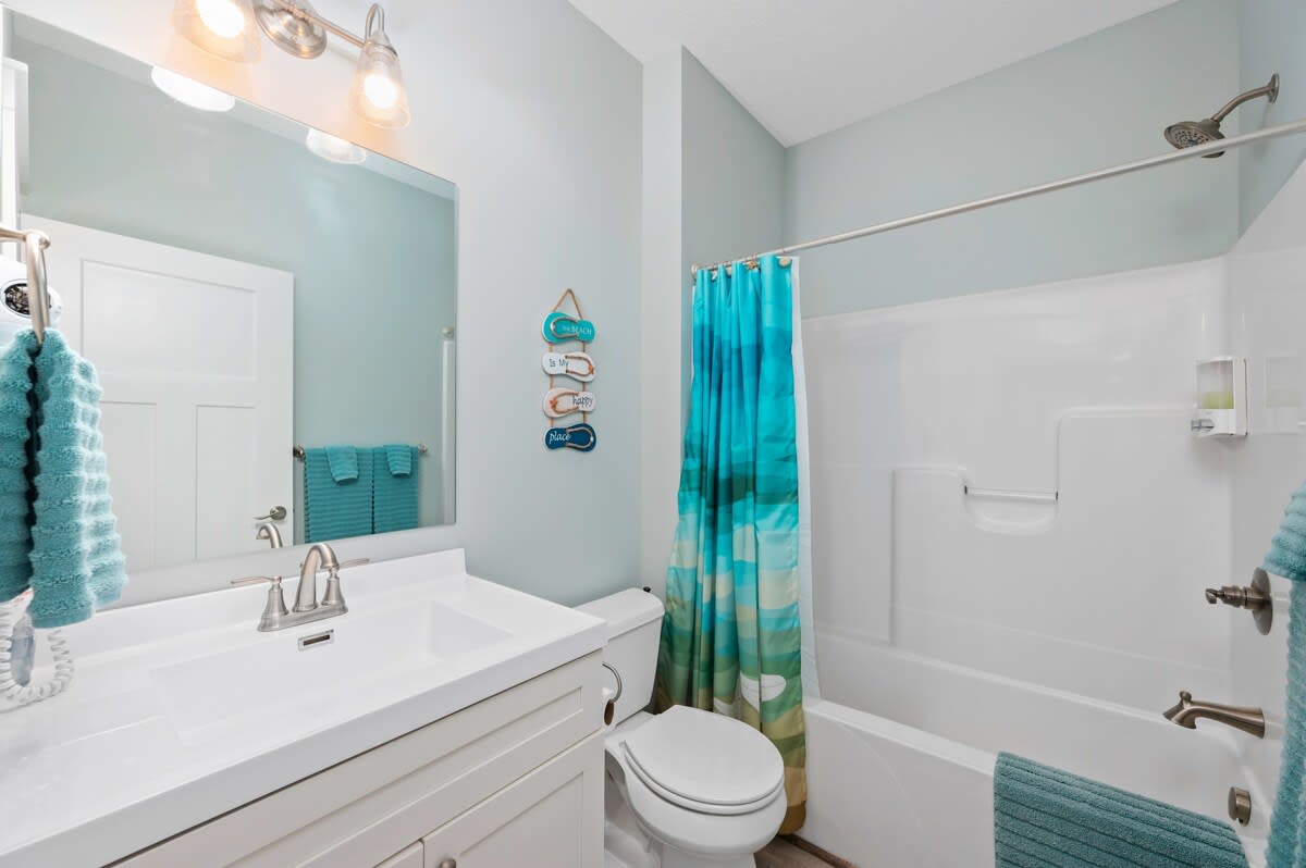 Walk into our master bedroom that has a king size bed, flat screen tv, and a walk in closet to fit all of your belongings (or new purchases). The master bedroom also has an ensuite bathroom, stocked with toiletry essentials. The guest bedroom has a queen bed along with a flat screen tv. Don’t worry if you decide to extend your stay, each unit comes with their own washer and dryer along with basic laundry supplies.