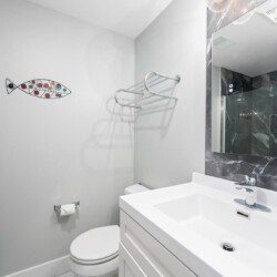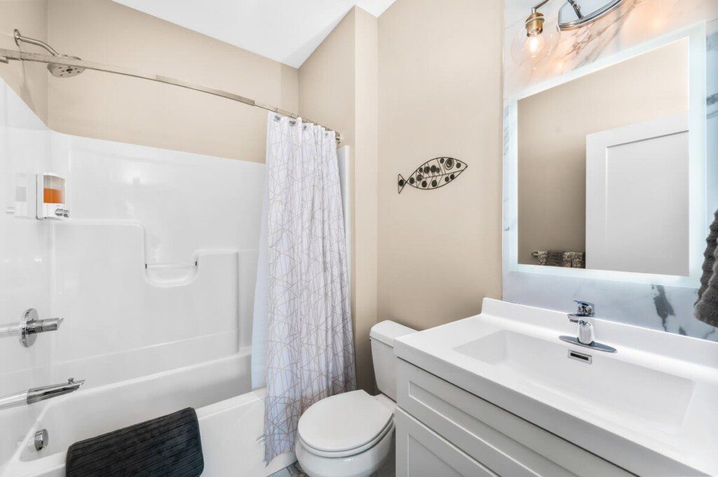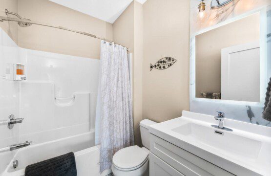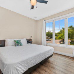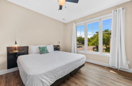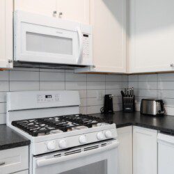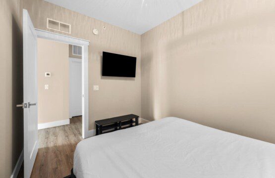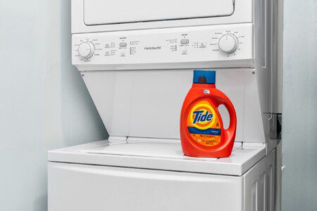Walk into our master bedroom that has a king size bed and 2 closets to fit all of your belongings (or new purchases). The master bedroom also has an ensuite bathroom, stocked with toiletry essentials. The guest bedroom has a queen bed along with a flat screen tv. Don’t worry if you decide to extend your stay, each unit comes with their own washer and dryer along with basic laundry supplies.