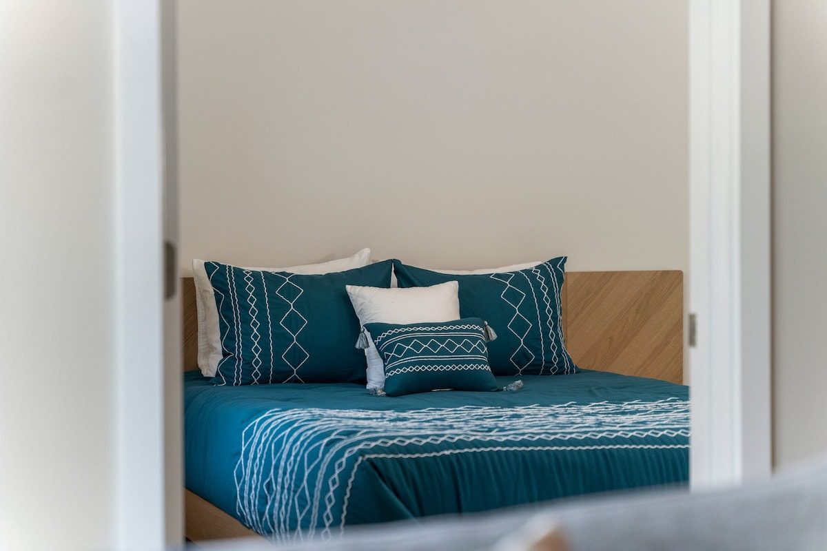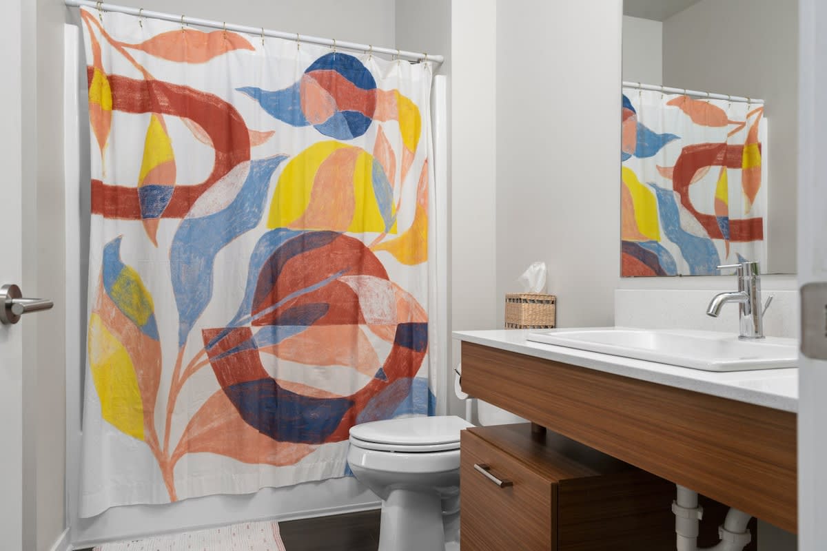 The bedroom hosts a cozy queen-sized bed, ensuring a restful night’s sleep after a day of exploration. The bedroom also boasts a convenient walk-in closet, which not only offers storage space but also houses a convenient washer and dryer for your laundry needs. Connected to the bedroom is a stylish bathroom, complete with a relaxing bathtub.