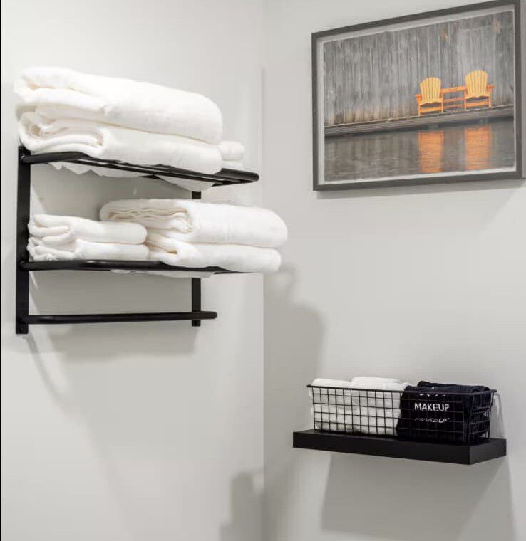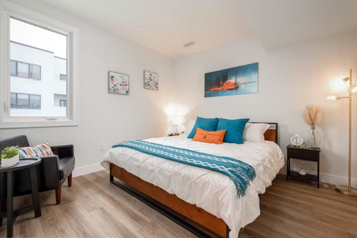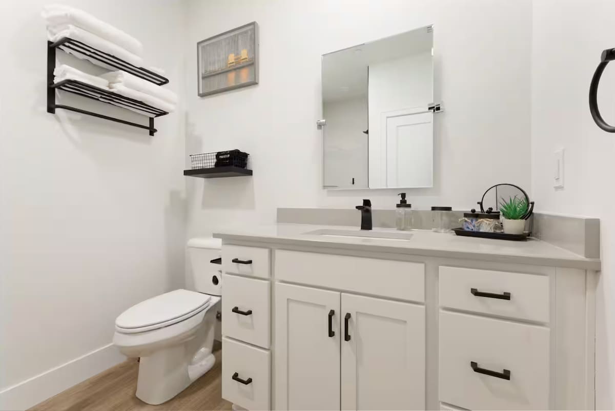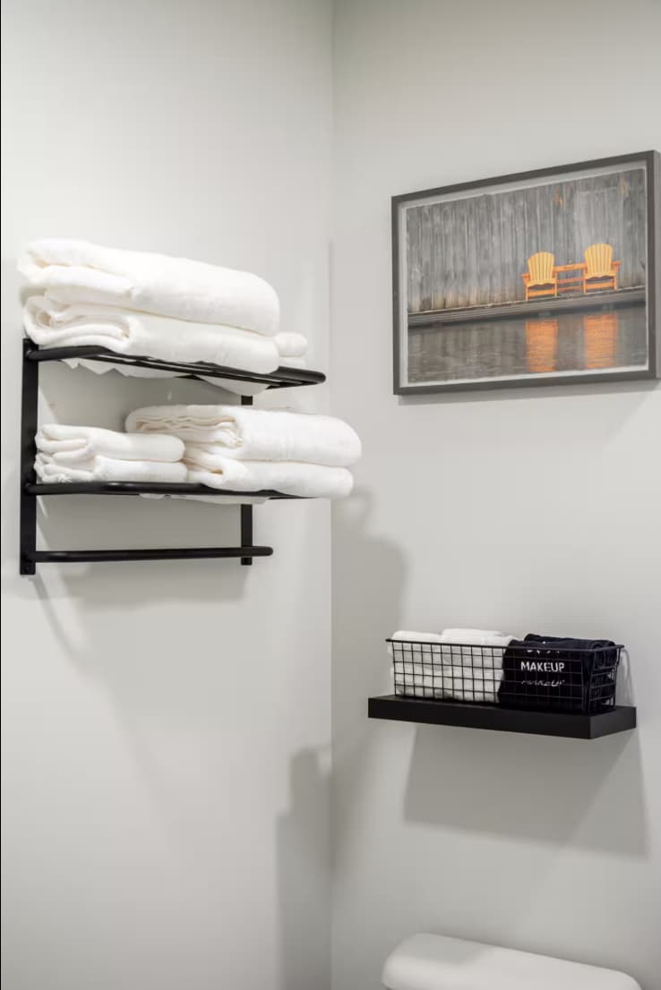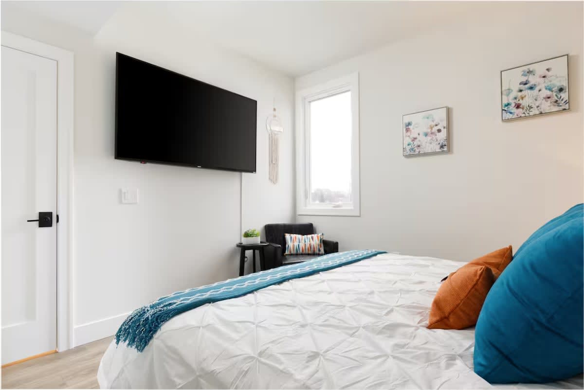 Next, walk into the primary bedroom which features a cozy king sized bed, closet, and a chair! (All linens included) You will also find a full bathroom stocked with towels, a hair dryer, shampoo, conditioner, body wash, and 3 rolls of toilet paper.