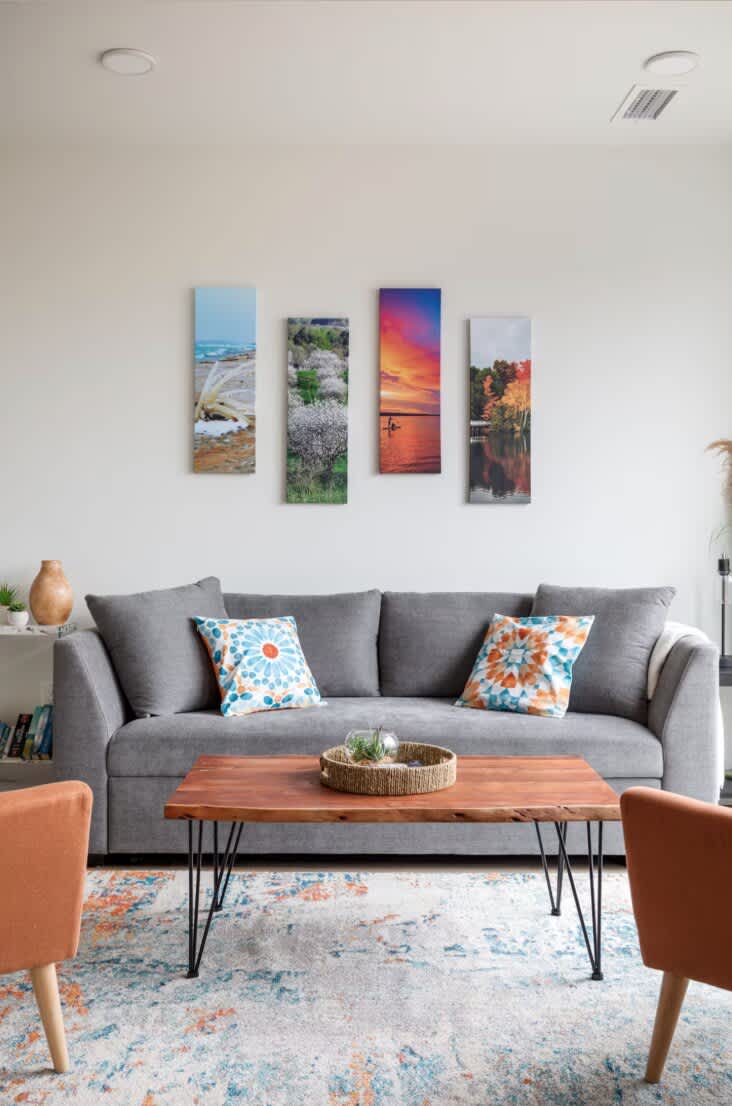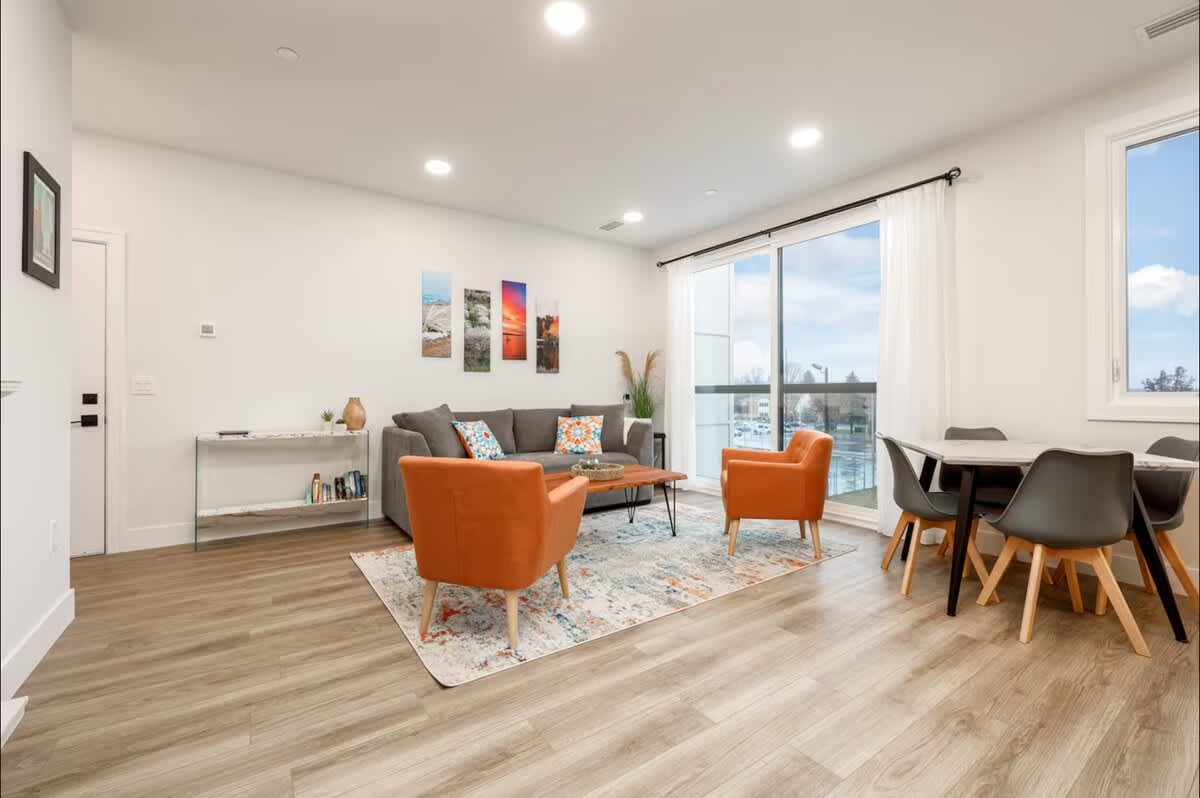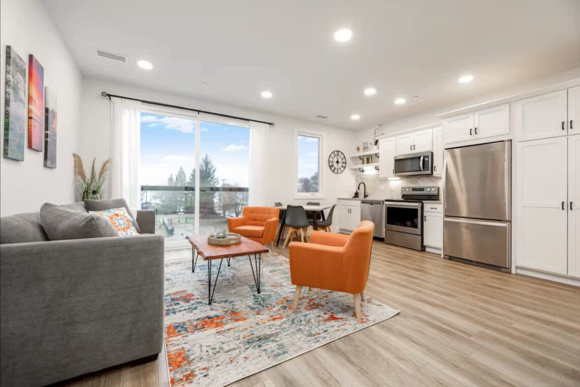 The spacious living room features a cozy couch that duals as a pullout sofa and has a large smart TV. This condos modern feel makes it the perfect place to gather after a long day of exploring!