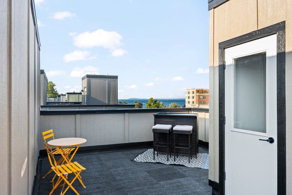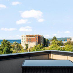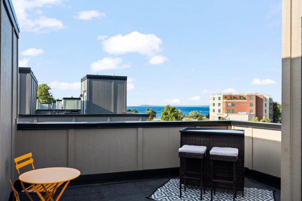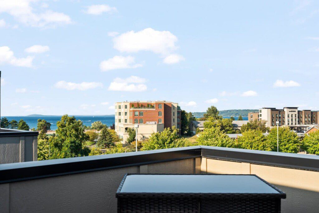 Indulge in a getaway at our luxurious and recently constructed three story, 2-bedroom, 2-bathroom condominium nestled in the center of Traverse City. This exquisitely fashioned condo showcases new appliances, upscale details, and a personal rooftop deck furnished with a relaxing lounge space, and bar, ensuring an extraordinary retreat in a highly desirable locale. This is the perfect place to rest your head after a long day of exploring all that Traverse City or surrounding areas have to offer.