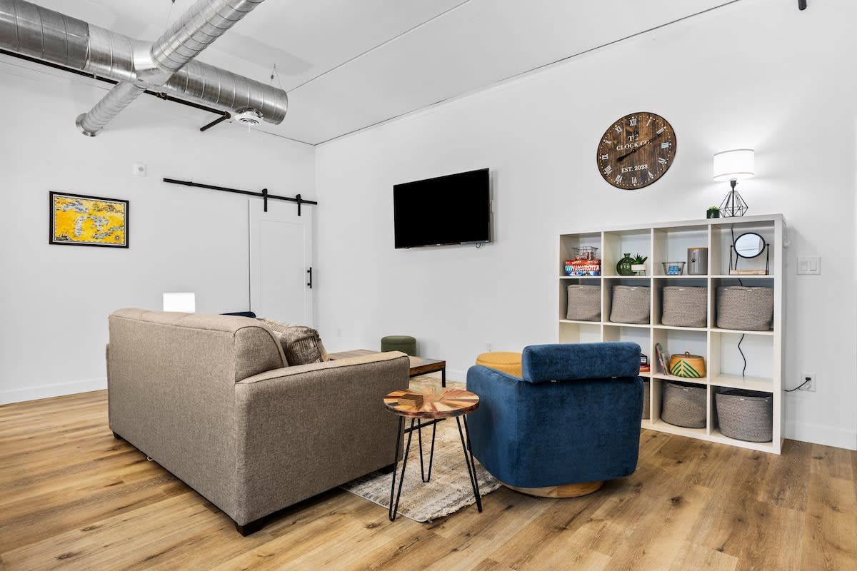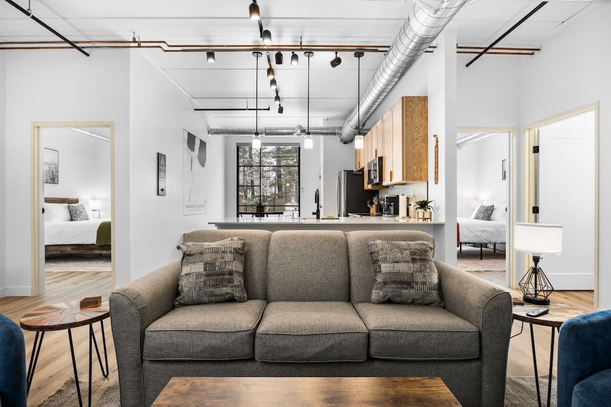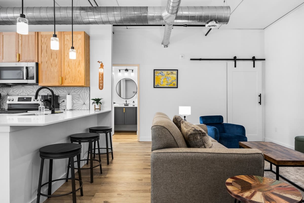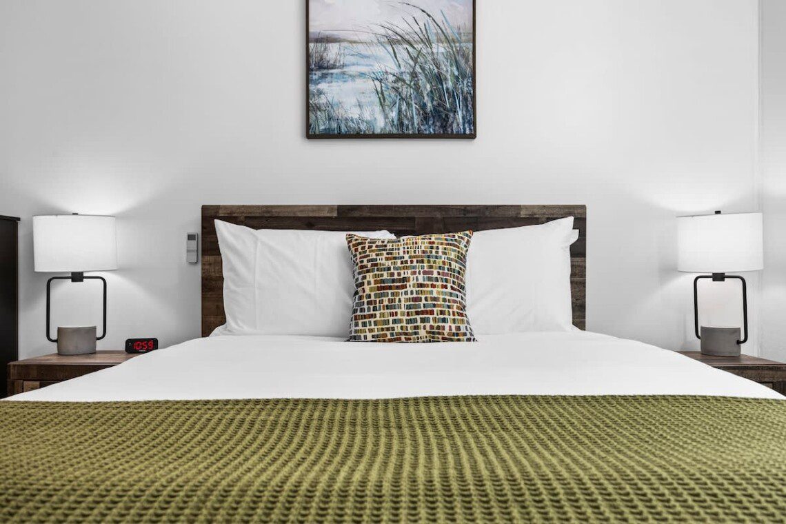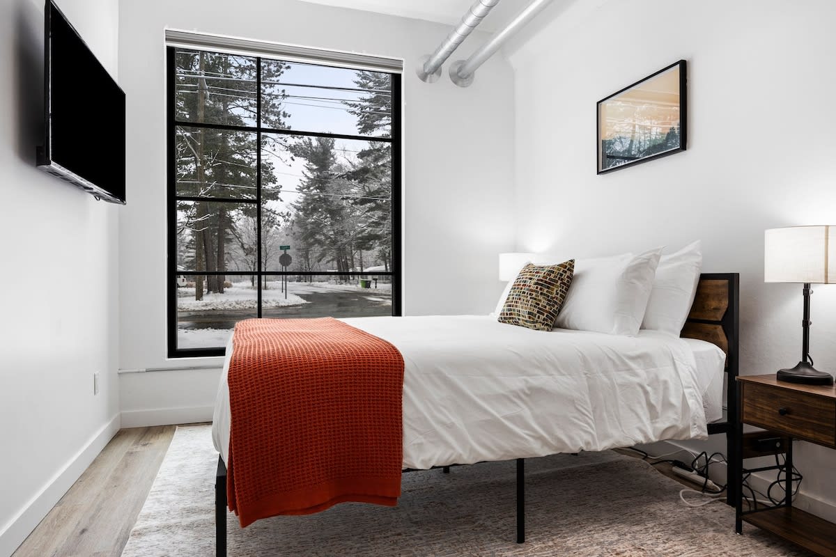 Step inside to this brand new build condo featuring an open concept that is sure to suit all your needs during your stay. The spacious living room features a smart TV and a pullout couch. The kitchen is equipped with stainless steel appliances, all the basic kitchen necessities, and a dinning room table to enjoy your favorite home cooked meals. Enjoy natural light throughout the entire space but feel free to close the blinds for more privacy. Both bedrooms hold a queen sized bed and a smart TVs for your convenience.