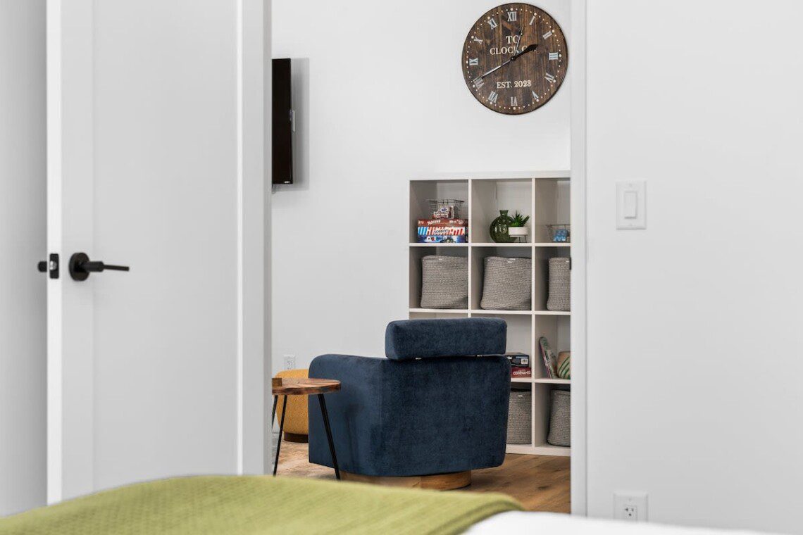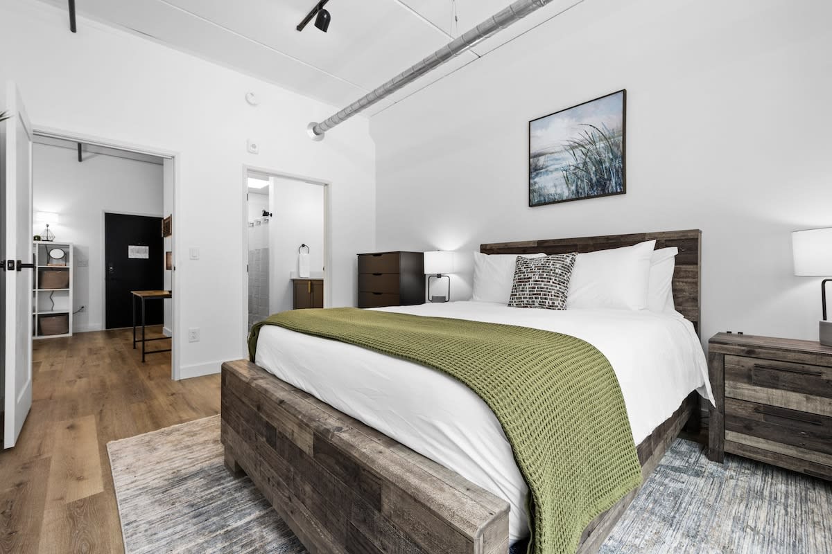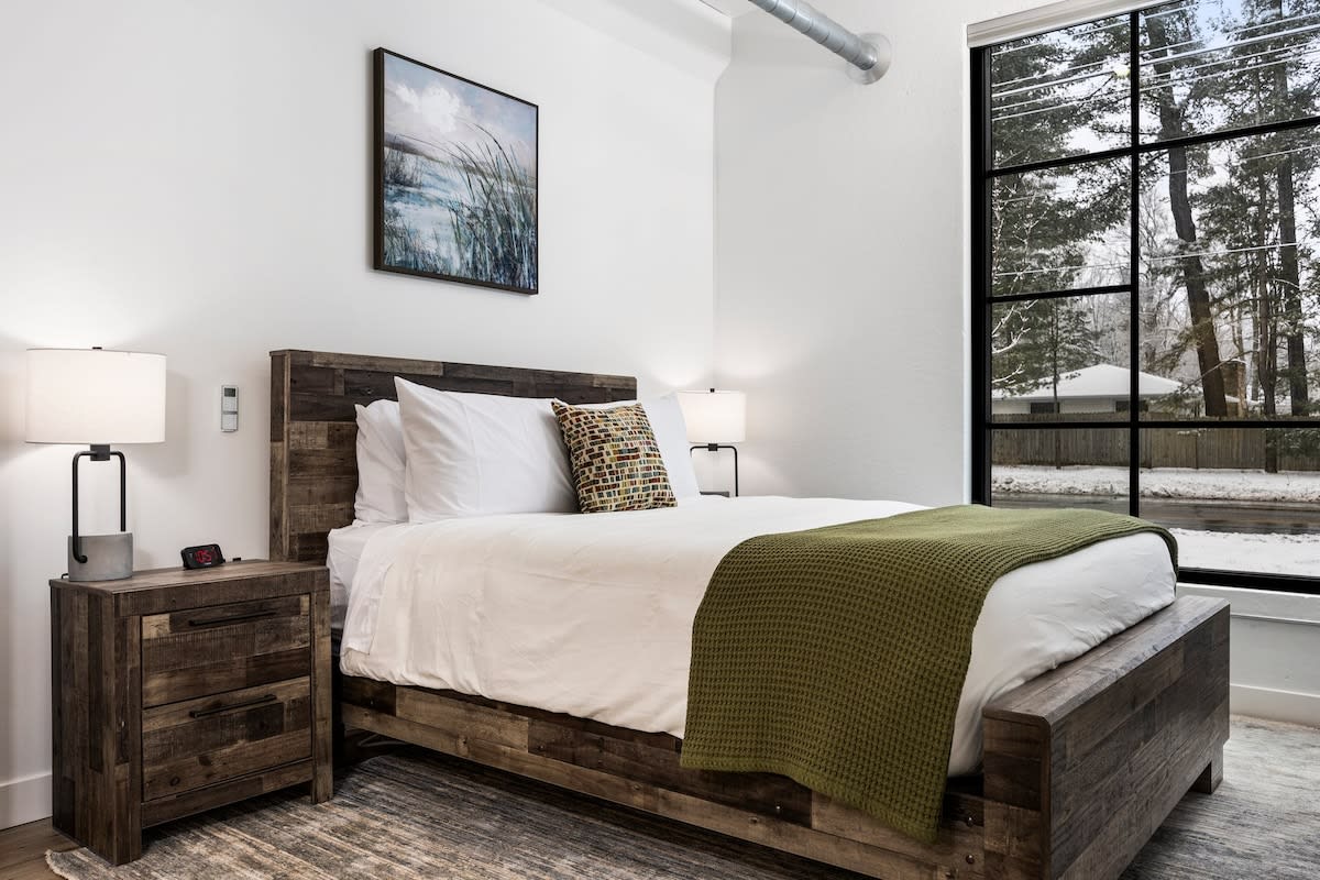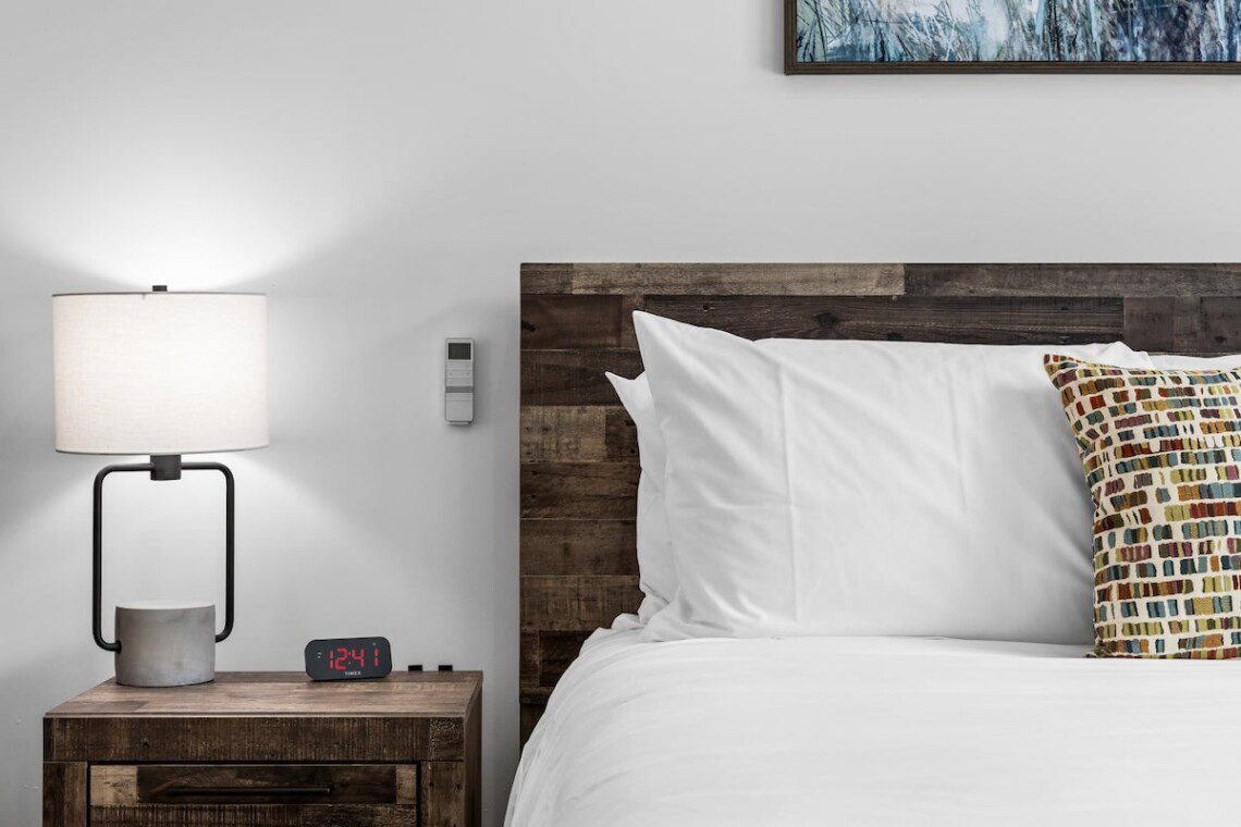 Charging ports are conveniently situated throughout the condo, integrated into lamps, alarm clocks, and nightstands.