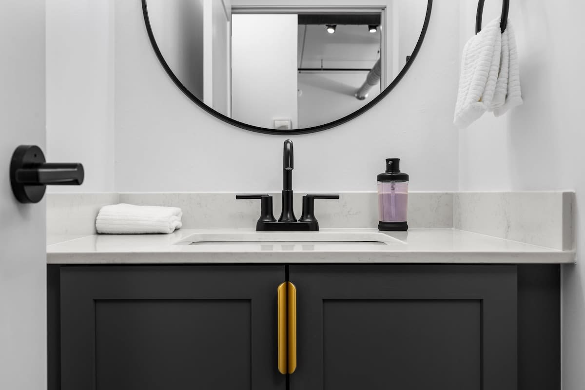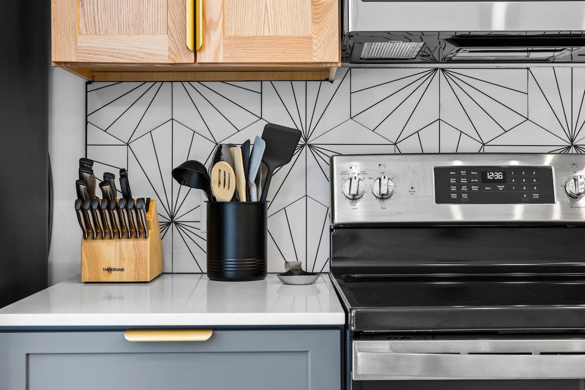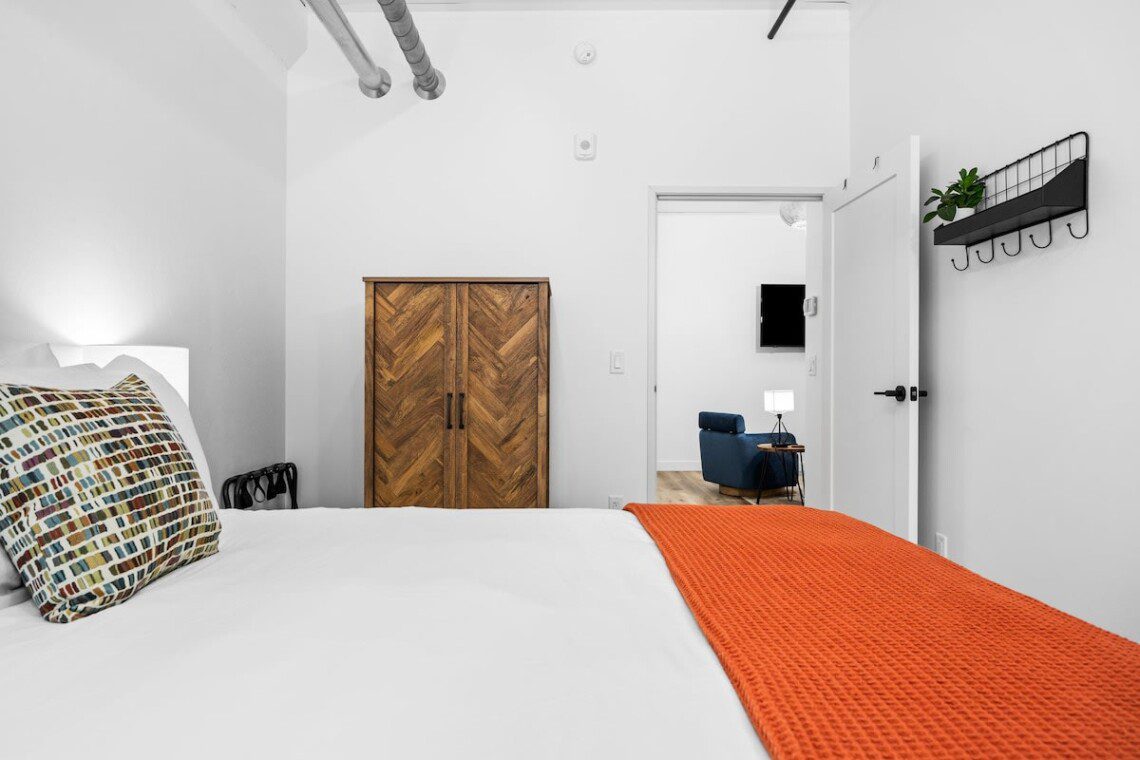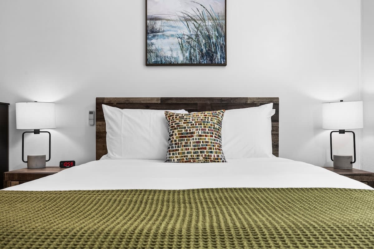 Charging ports are conveniently situated throughout the condo, integrated into lamps, alarm clocks, and nightstands.