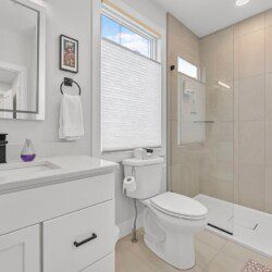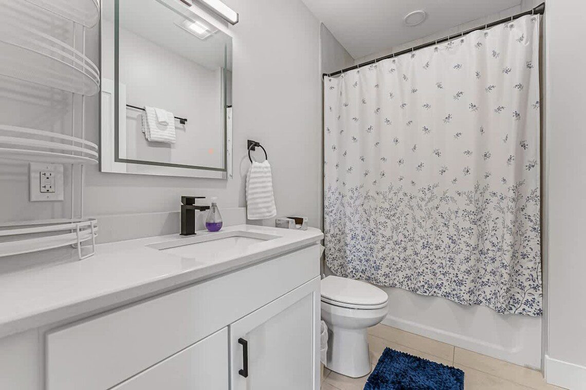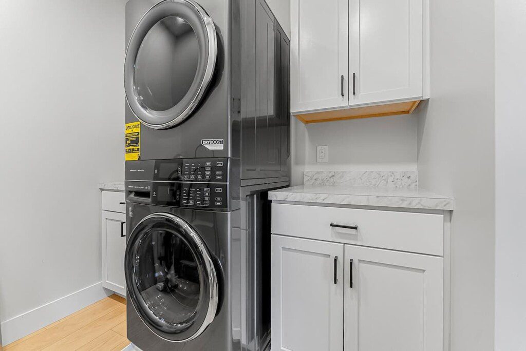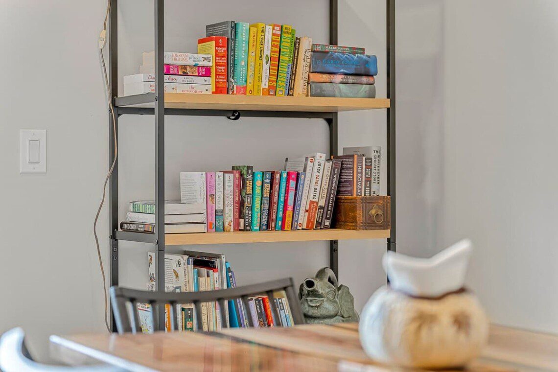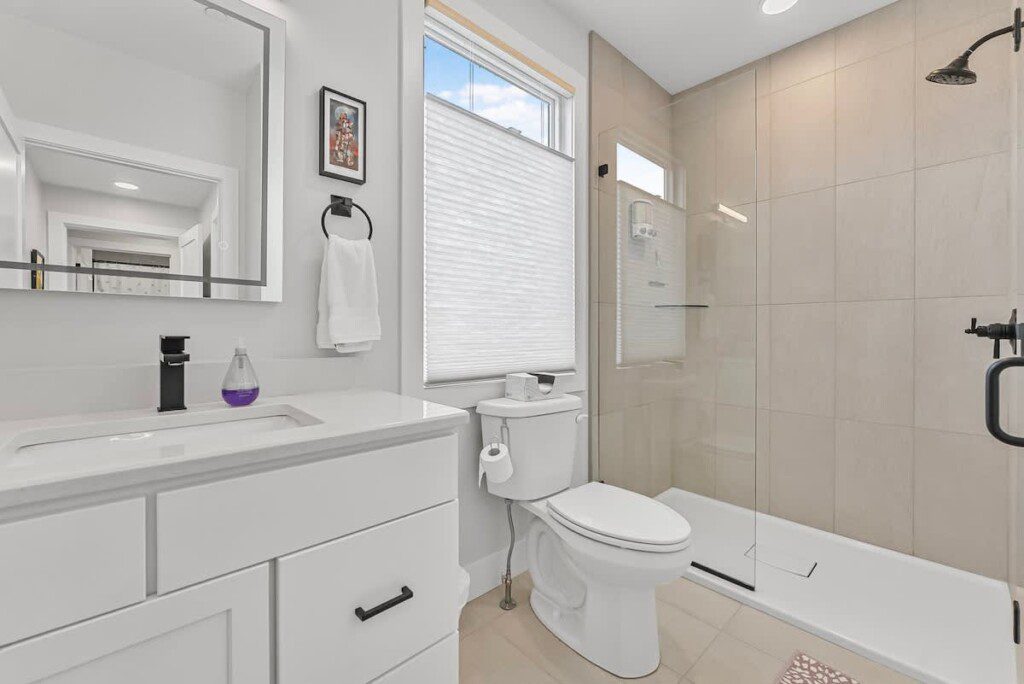 Enjoy the convenience of in-unit laundry, modern bathrooms with sleek black fixtures, and a curated collection of books and games to unwind with.