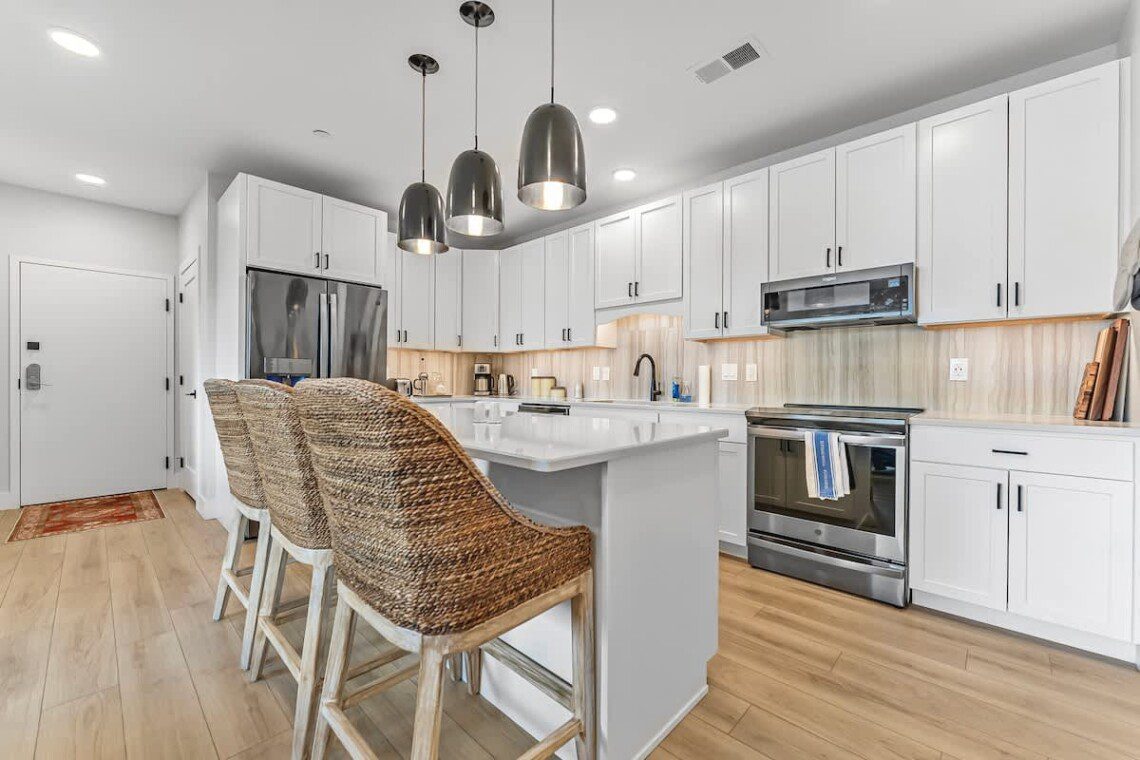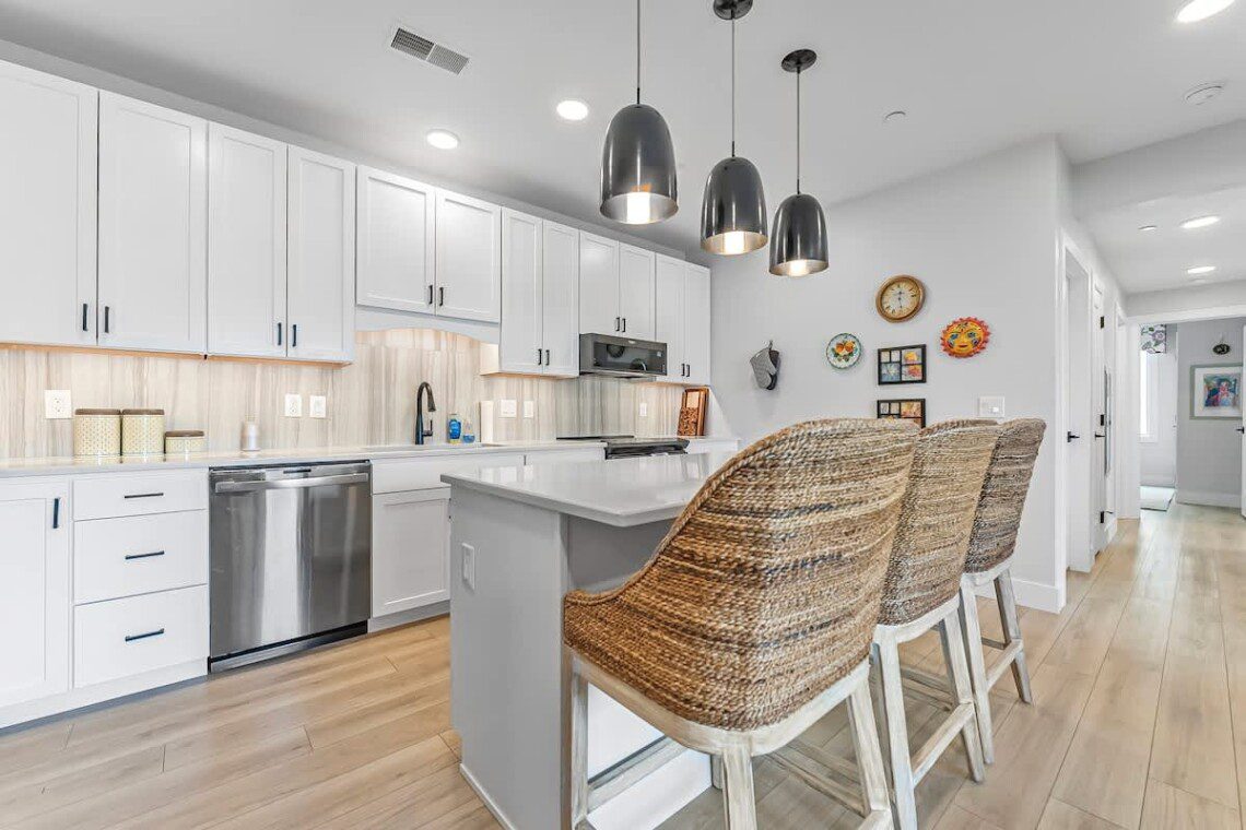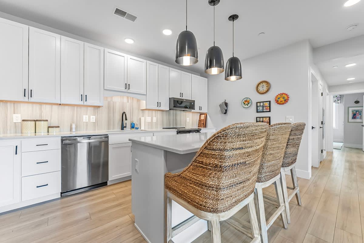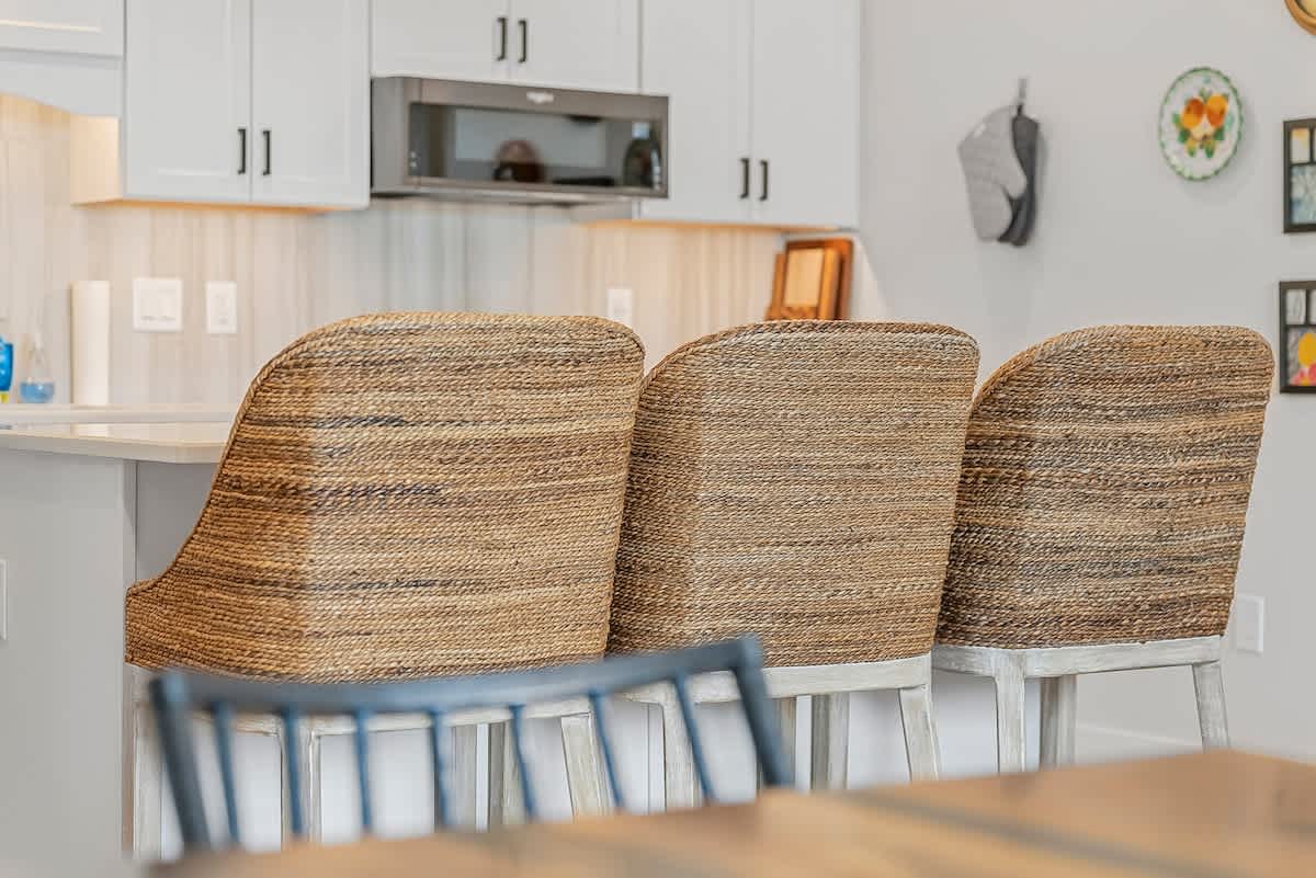 The fully equipped kitchen includes all the essentials—pots, pans, utensils, toaster, coffee maker, and more—plus a spacious island with comfortable barstools and a dining table that seats six. (picture shows four but there are two extra chairs in the closet you can use at the end of the table!)