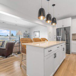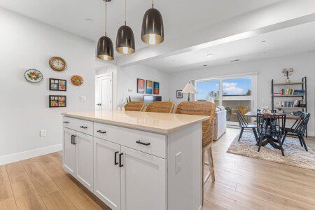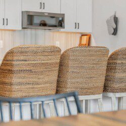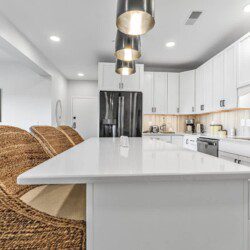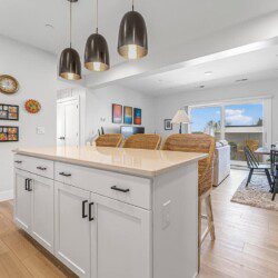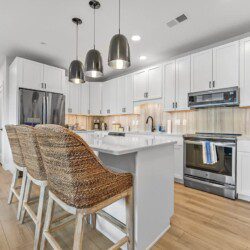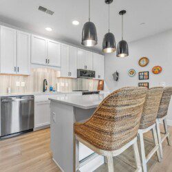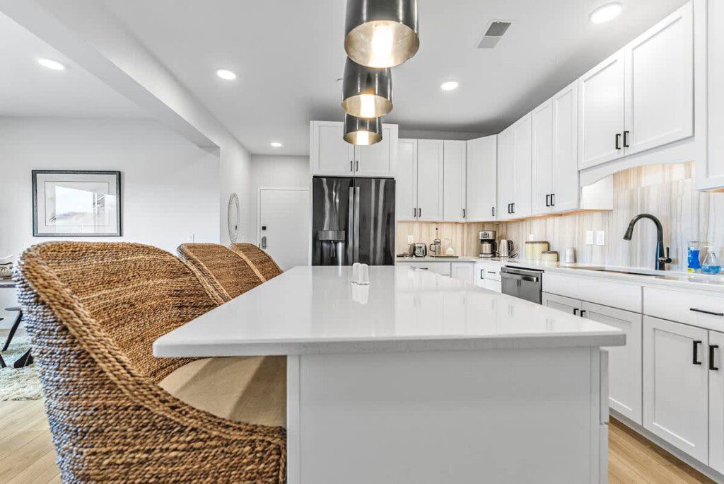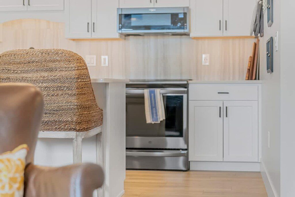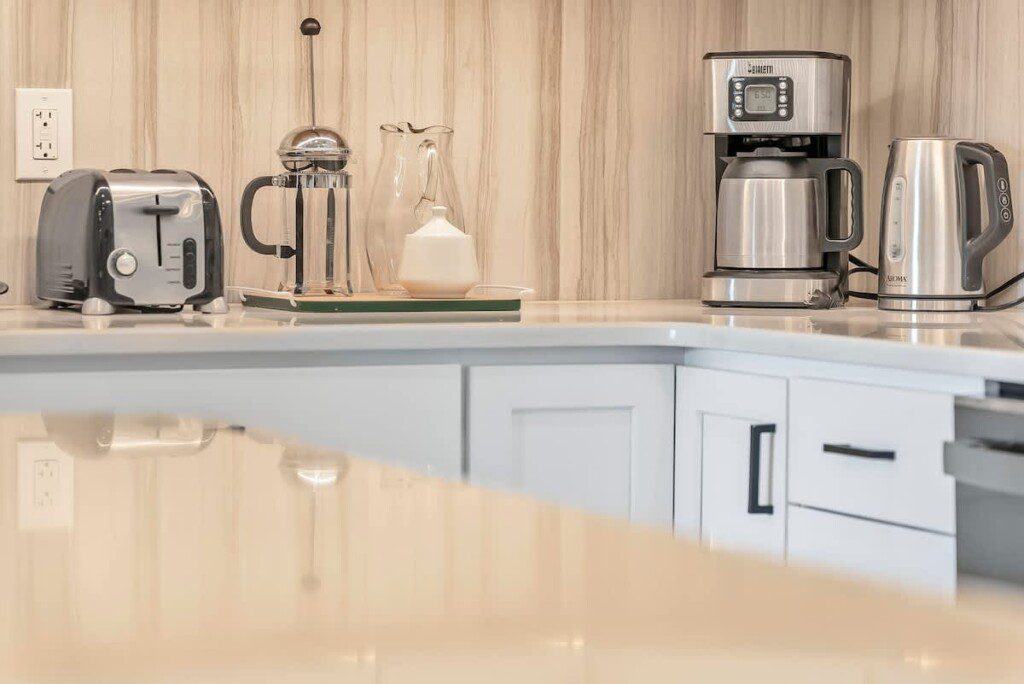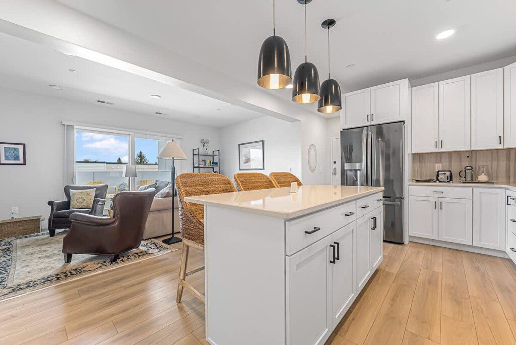 The fully equipped kitchen includes all the essentials—pots, pans, utensils, toaster, coffee maker, and more—plus a spacious island with comfortable barstools and a dining table that seats six. (picture shows four but there are two extra chairs in the closet you can use at the end of the table!)