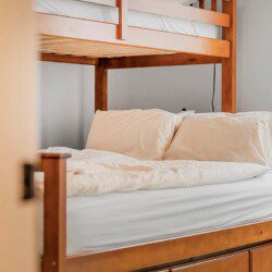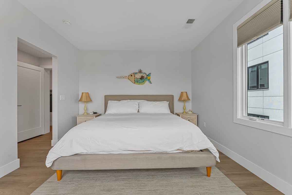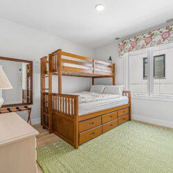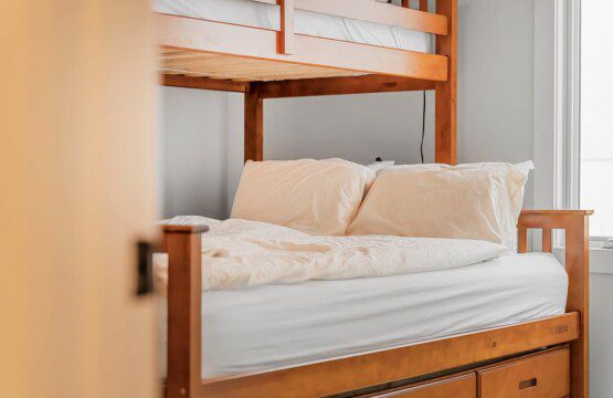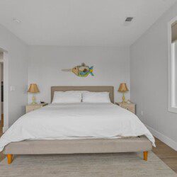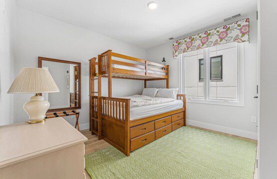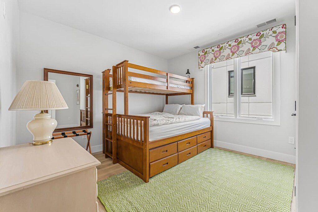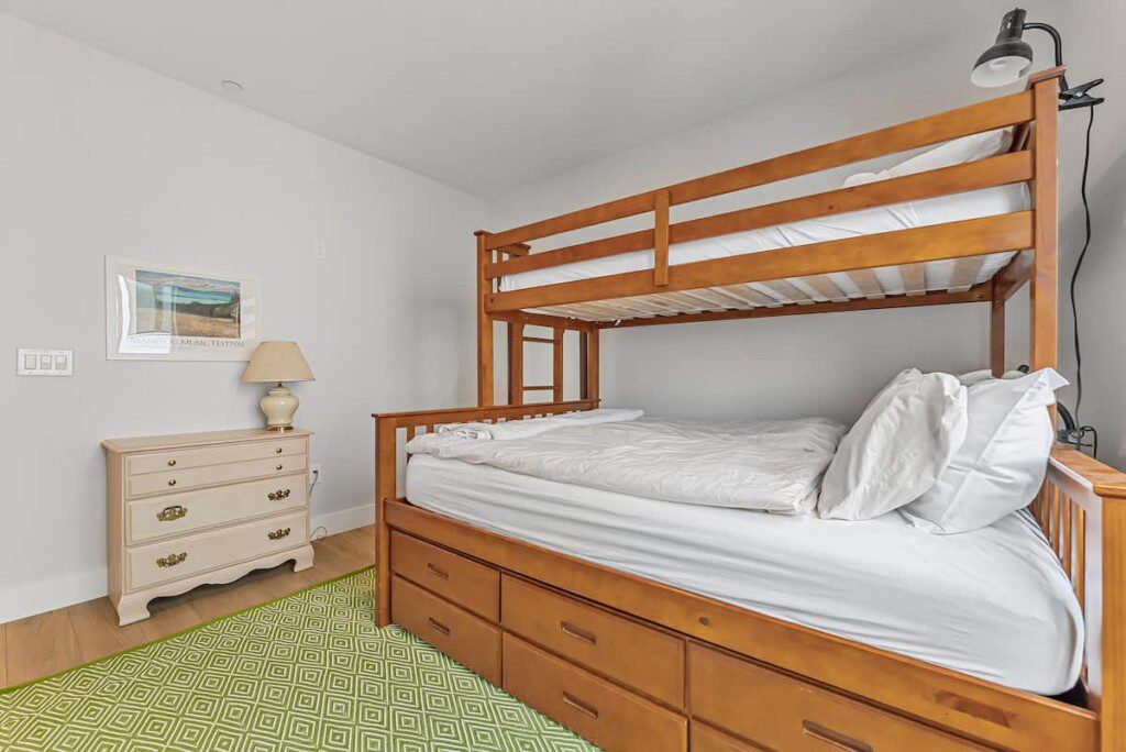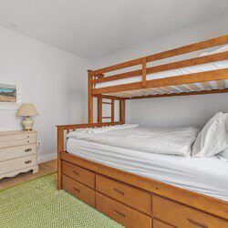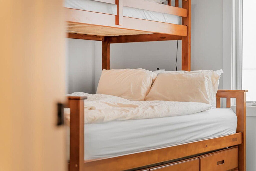 The primary bedroom offers a king-size bed, smart TV, closet space, and an en-suite bath with a walk-in shower. The second bedroom includes a bunk bed with a queen bed on the bottom, twin on top, and a pull-out twin trundle—ideal for families or groups.