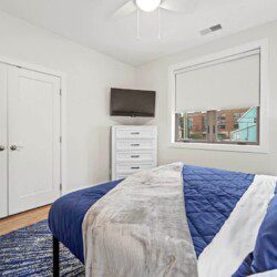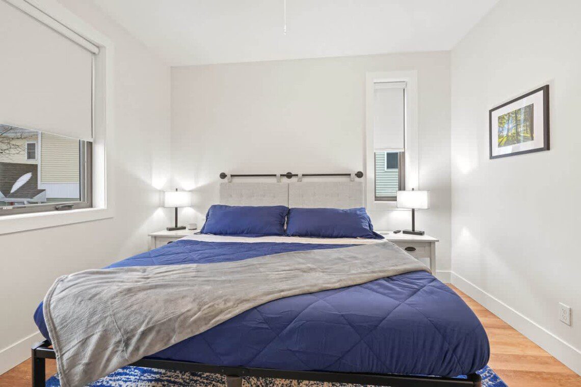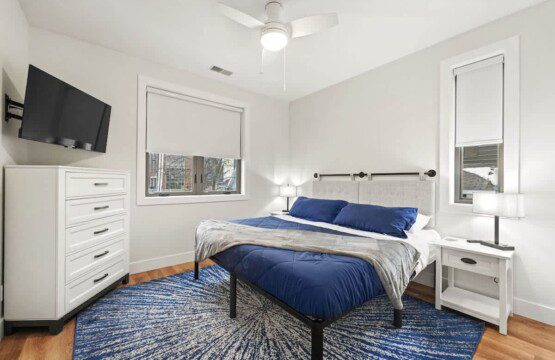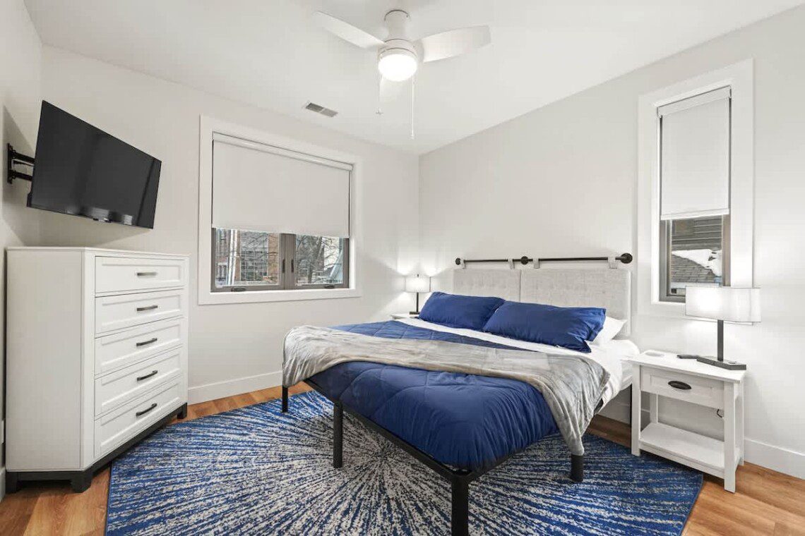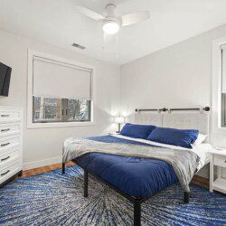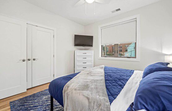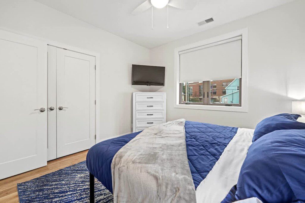 King bed with a comfortable memory foam mattress, two night stands with smart lamps/charging ports, modern room darkening shades, a ceiling fan, a full sized closet with luggage rack, hangers, additional linens, pillows, and a mounted smart Roku TV with Spectrum cable, Hulu, Disney Plus, and Paramount +, or log into your favorite streaming platform
