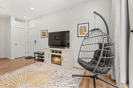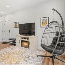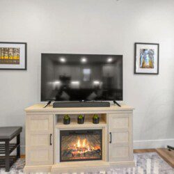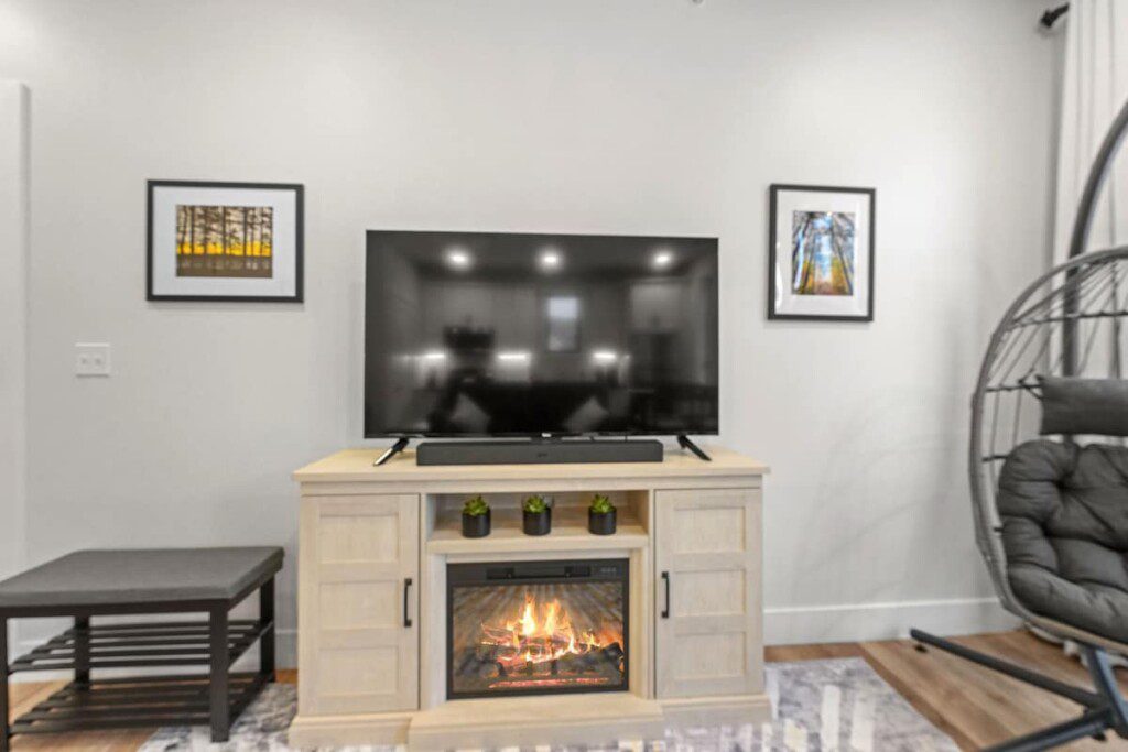 Cozy up to the electric heated fireplace and smart Roku TV with Spectrum cable, Hulu, Disney Plus, and Paramount +, or log into your favorite streaming platform