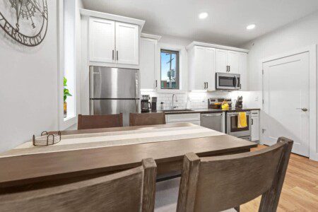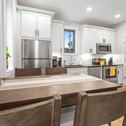 The kitchen is stocked with a full sized refrigerator, dishwasher, dining table & chairs, and all the cooking and cocktail essentials for meal and drink preparation.