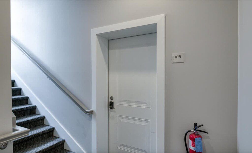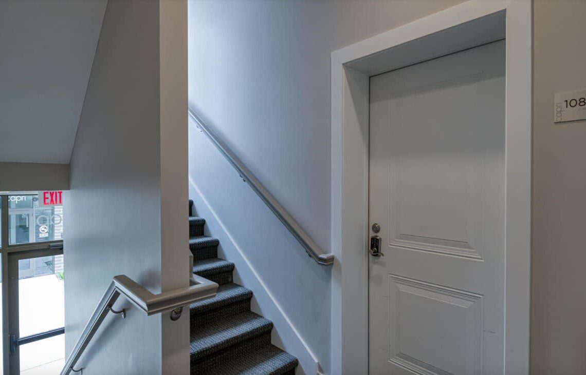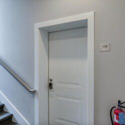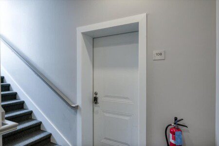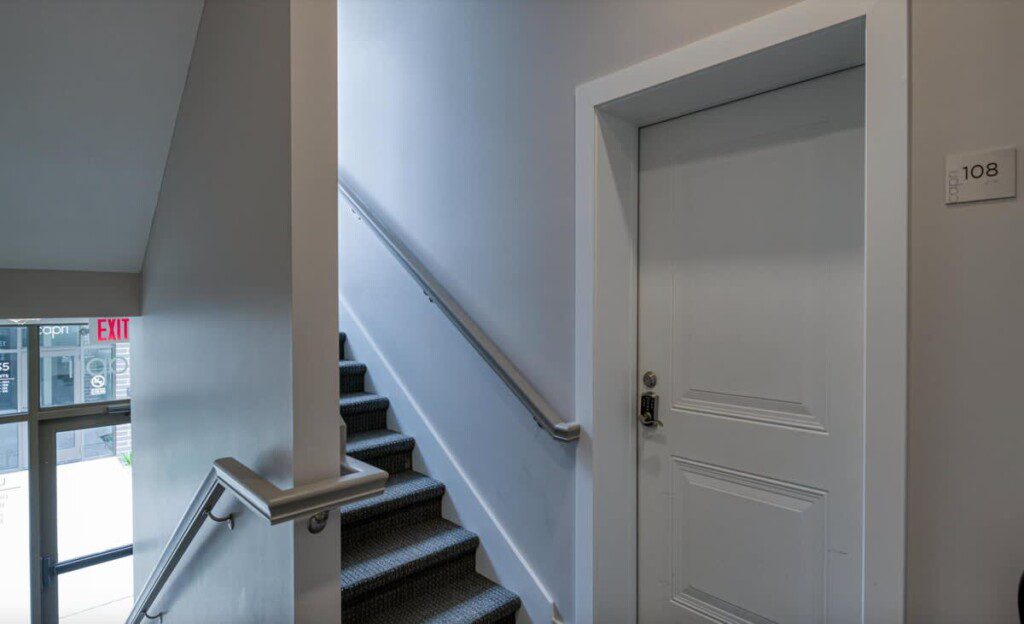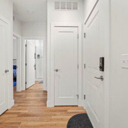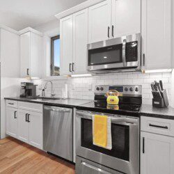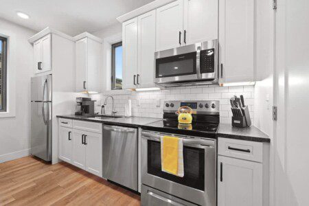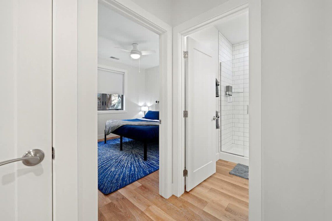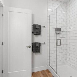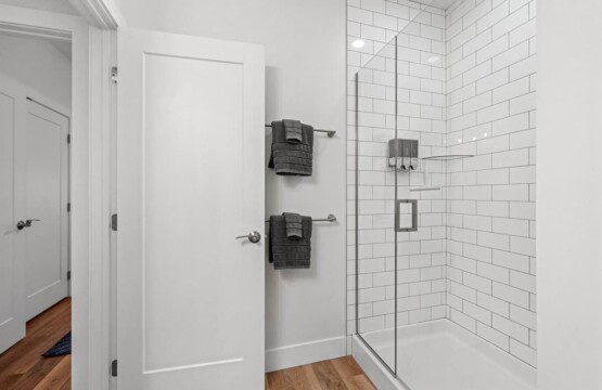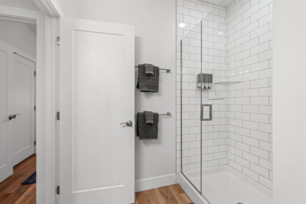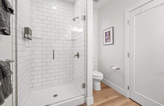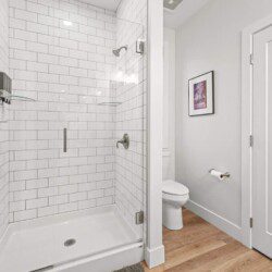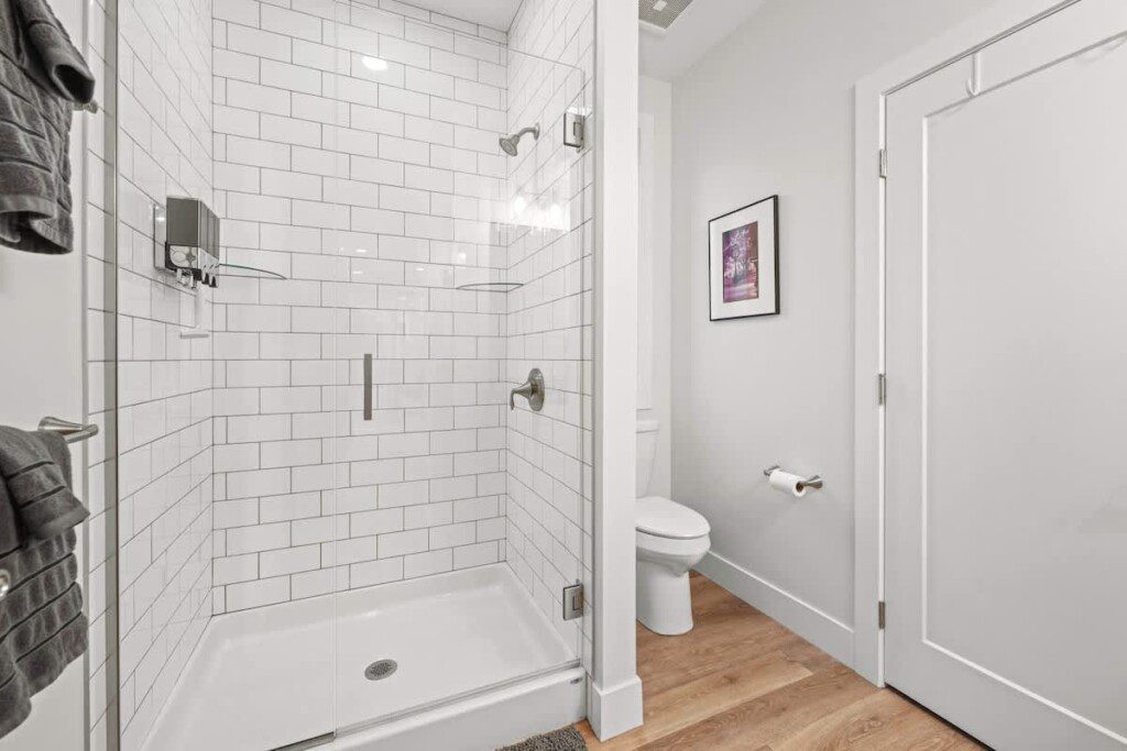 A beautiful modern subway tiled full shower with glass doors, 9 foot ceilings, and starter toiletries provided, including shampoo, conditioner, and body-wash