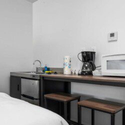 The studio apartment boasts two queen sized beds, providing a restful sanctuary after a day of exploring the city. The kitchenette is equipped with a mini fridge and a 2-burner stove, allowing you to prepare your own meals and snacks at your convenience (basic cookware is provided).