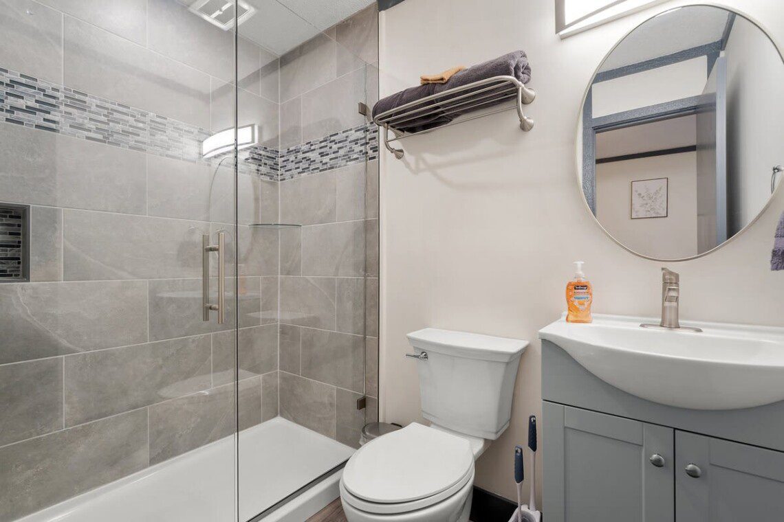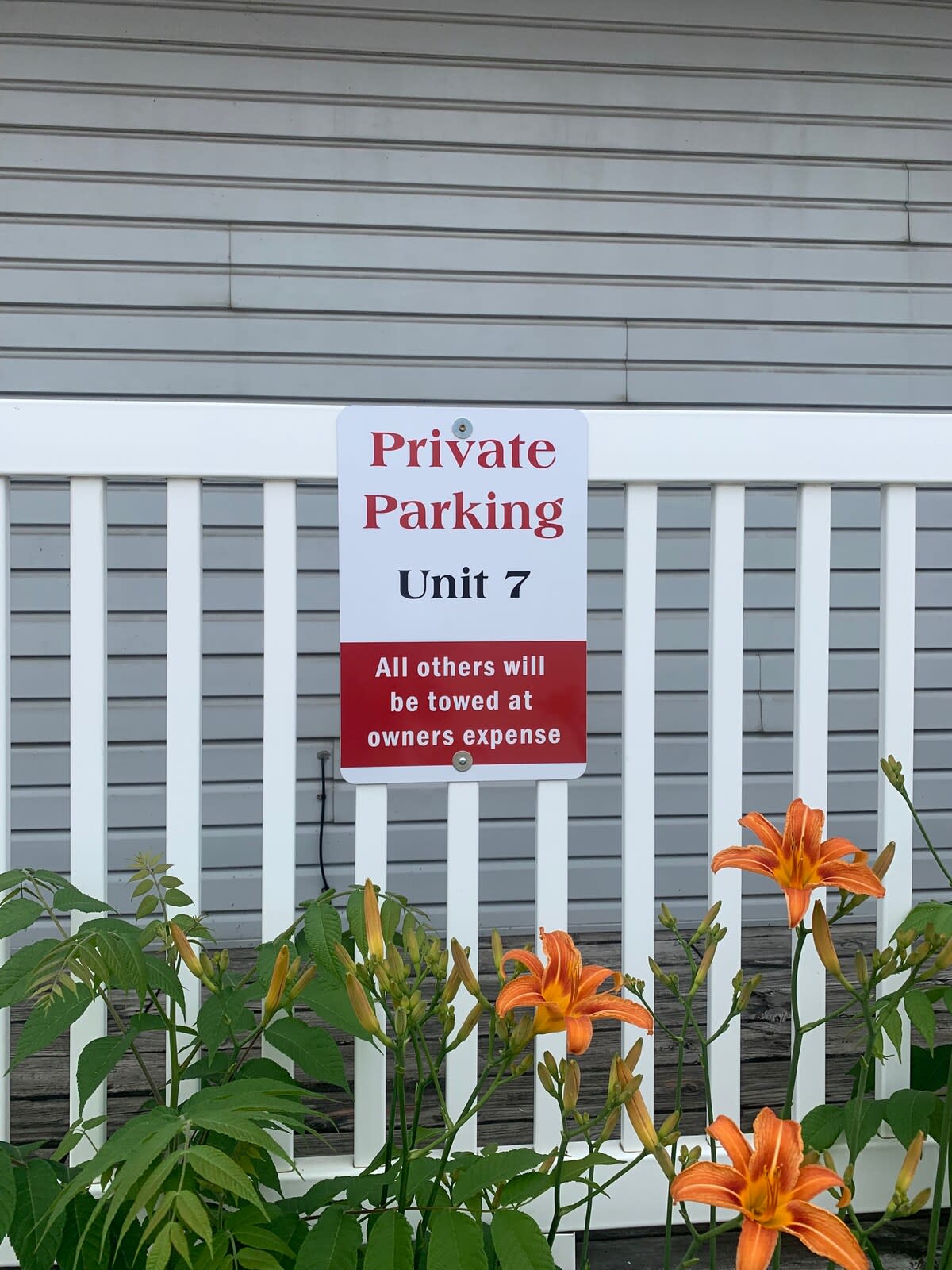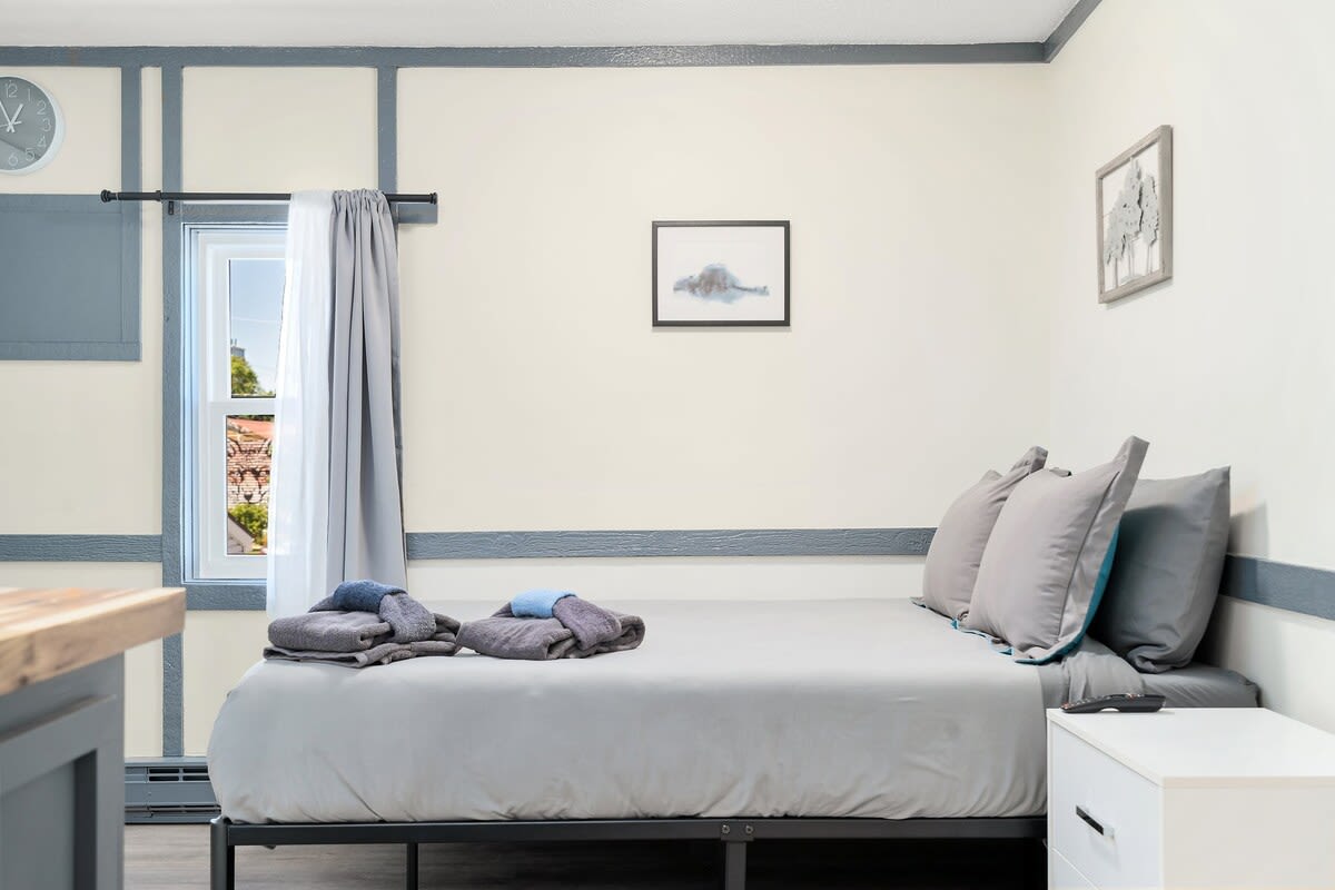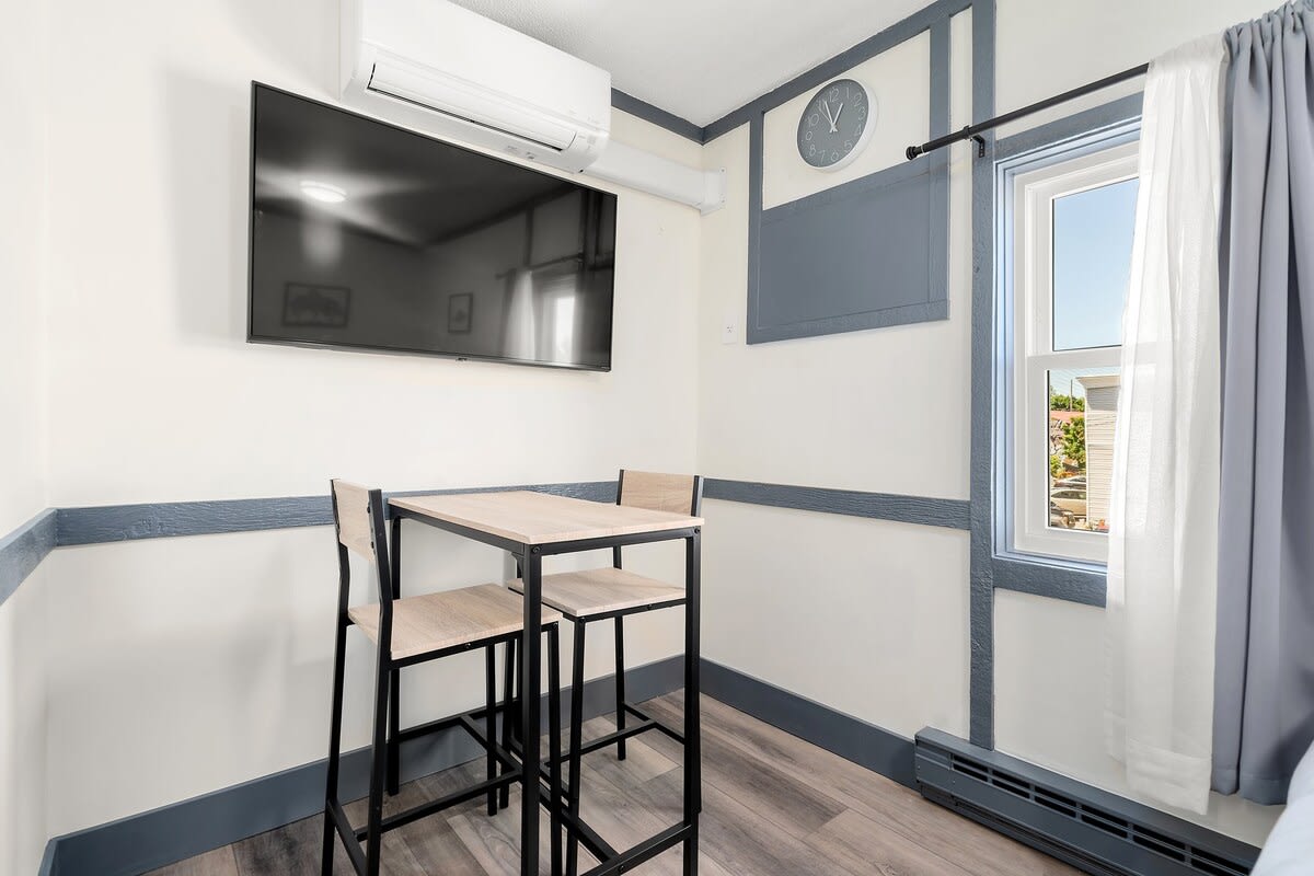 Guaranteed one parking spot, upon arrival you will take one flight of stairs to locate Suite 7. Using the smart lock with your unique door code you will walk into this beautiful one-bedroom studio. This room features a queen size bed and a large smart TV. While this condo doesn’t have a full kitchen you will still find it equipped with a mini fridge, microwave, a Keurig, and some K-cups to get your trip started on the right foot. There is also a small dining room table you can take meetings from or enjoy take-out from one of the many delicious restaurants nearby. This suite also has its own ensuite bathroom that has a luxury tile shower.