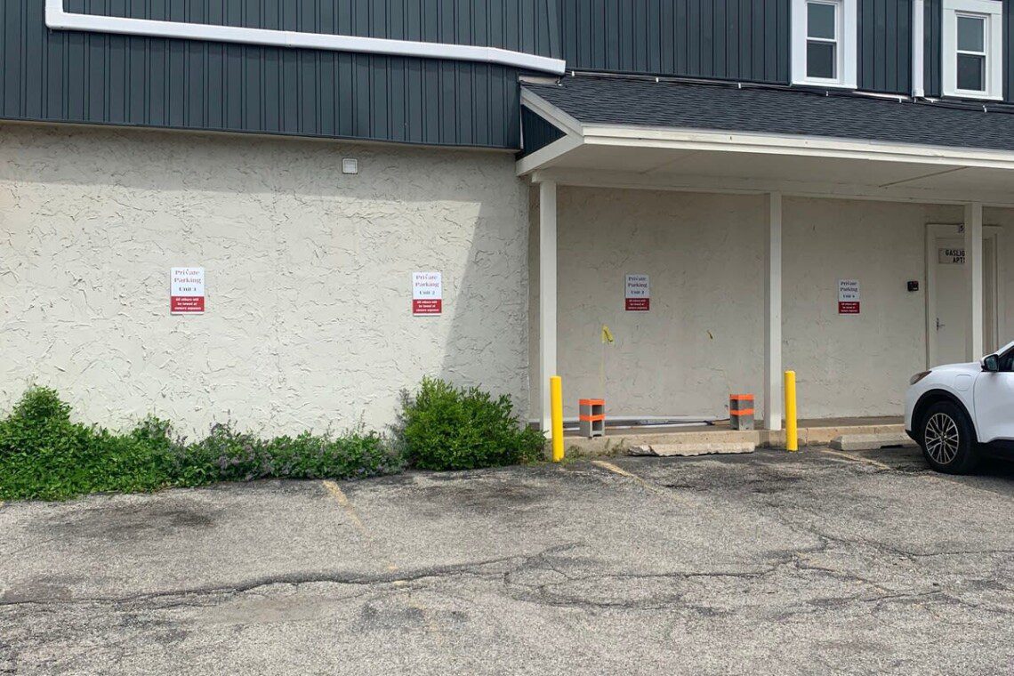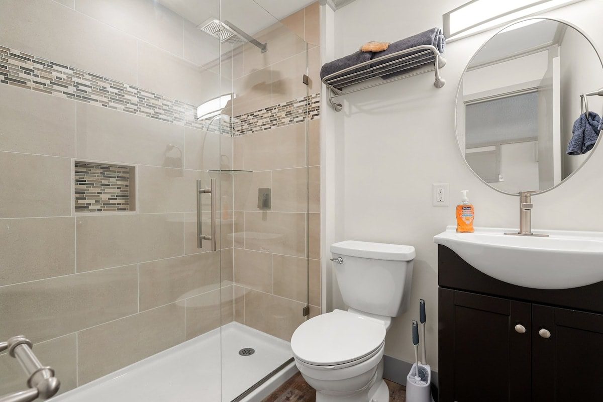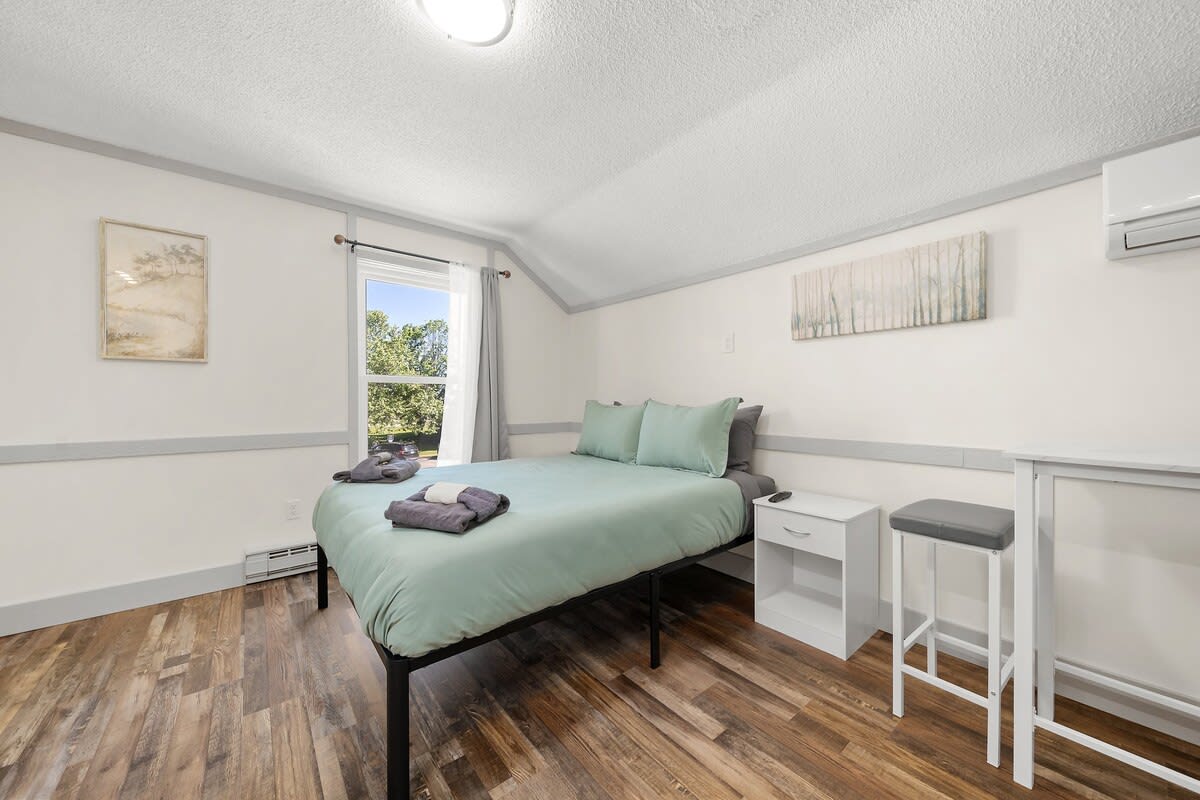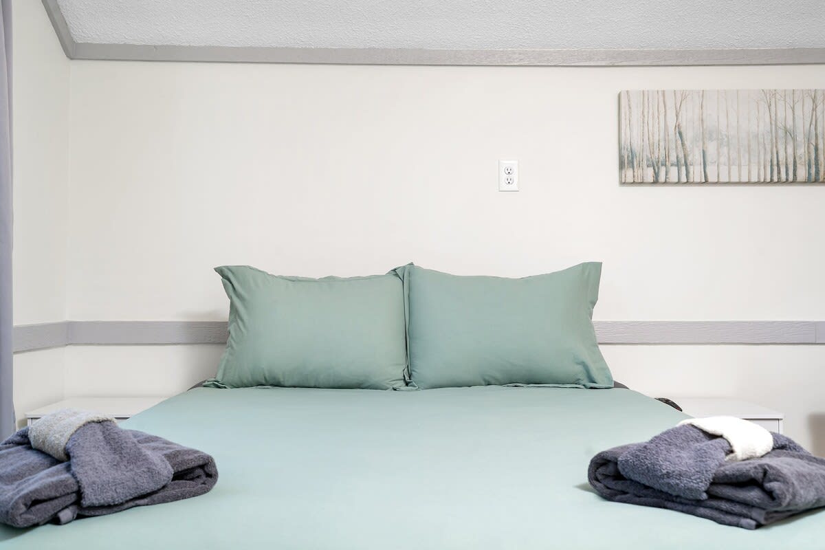 Guaranteed one parking spot, upon arrival you will take one flight of stairs to locate Suite 2. Using the smart lock with your unique door code you will walk into this beautiful one-bedroom studio. This room features a queen size bed and a large smart TV. While this condo doesn’t have a full kitchen you will still find it equipped with a mini fridge, microwave, a Keurig, and some K-cups to get your trip started on the right foot. There is also a small dining room table you can take meetings from or enjoy take-out from one of the many delicious restaurants nearby. This suite also has its own ensuite bathroom that has a luxury tile shower. *Please note there is a slight step up from the main room into the bathroom*