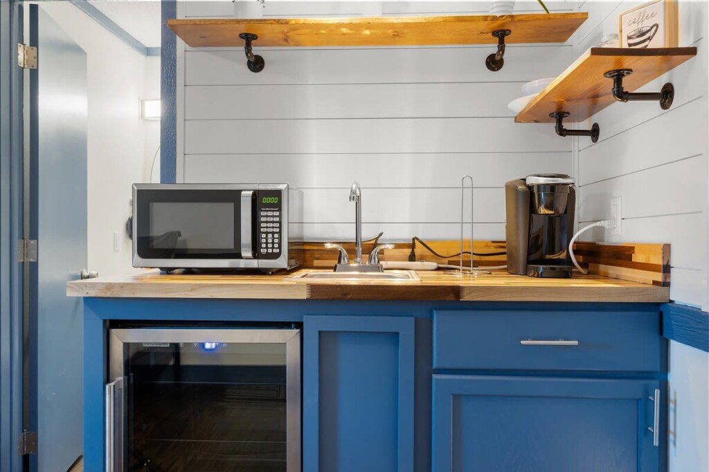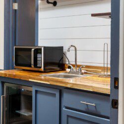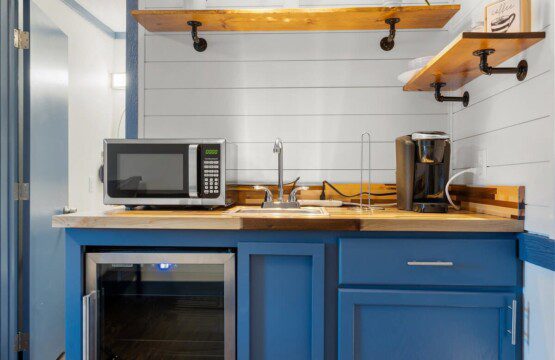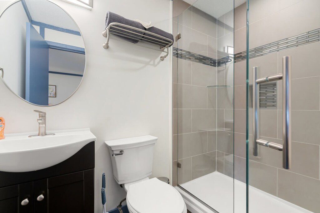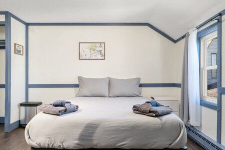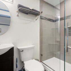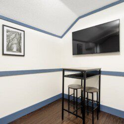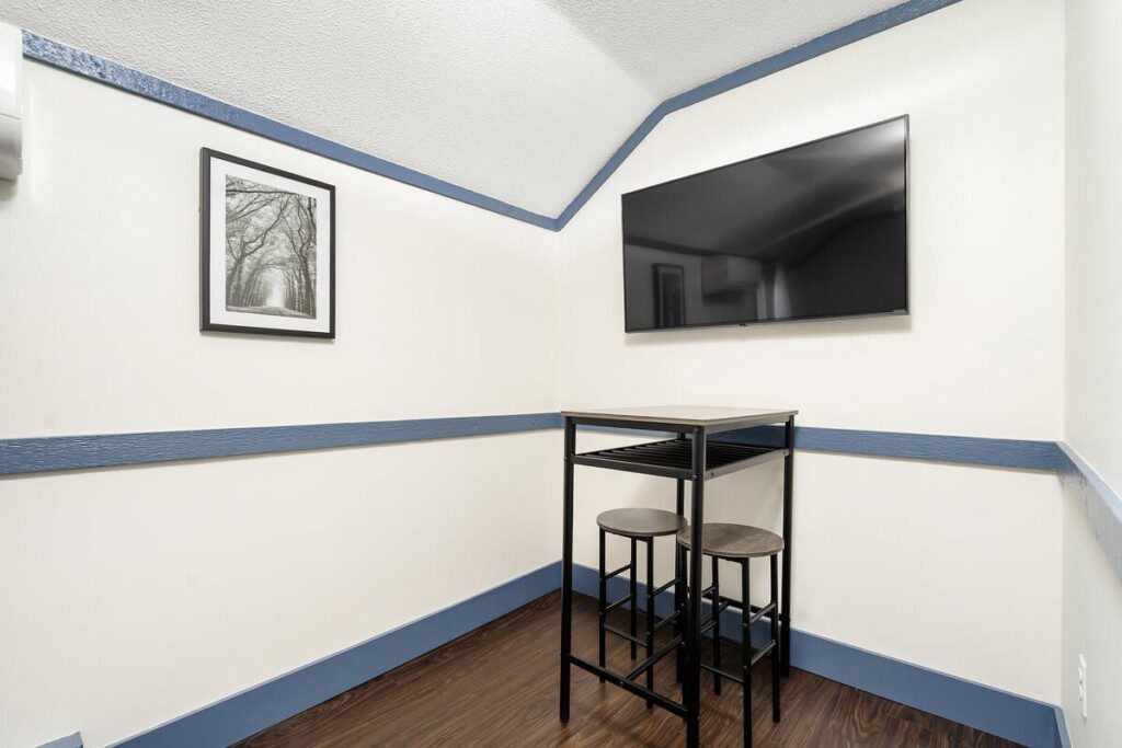 Guaranteed one parking spot, upon arrival you will take one flight of stairs to locate Suite 8. Using the smart lock with your unique door code you will walk into this beautiful one-bedroom studio. This room features a queen size bed and a large smart TV. While this condo doesn’t have a full kitchen you will still find it equipped with a mini fridge, microwave, a Keurig, and some K-cups to get your trip started on the right foot. There is also a small dining room table you can take meetings from or enjoy take-out from one of the many delicious restaurants nearby. This suite also has its own ensuite bathroom that has a luxury tile shower.
