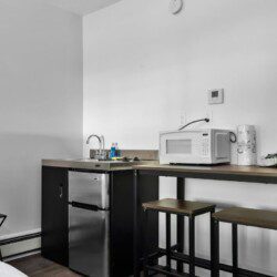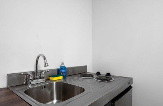 The studio apartment boasts a plush king-size bed, providing a restful sanctuary after a day of exploring the city. The kitchenette is equipped with a mini fridge and a 2-burner stove, allowing you to prepare your own meals and snacks at your convenience. (basic cookware is provided)