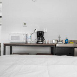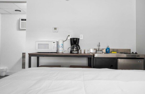 The studio apartment boasts two queen sized beds, providing a restful sanctuary after a day of exploring the city. The kitchenette is equipped with a mini fridge and a 2-burner stove, allowing you to prepare your own meals and snacks at your convenience (basic cookware is provided).