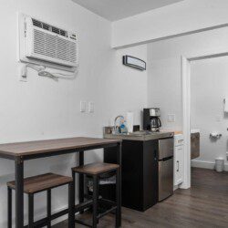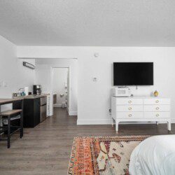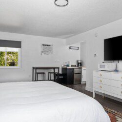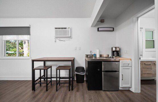 In addition to its fantastic location and well-appointed amenities, this studio apartment also offers complimentary Wi-Fi, ensuring you stay connected throughout your stay. It also features a Smart TV where you can access live TV through the Hulu app or log into any of your own personal accounts. Parking is available on-site, adding to your convenience, but only has space for one car per unit.