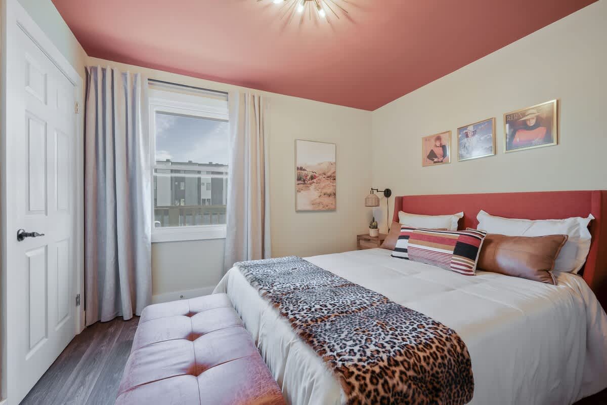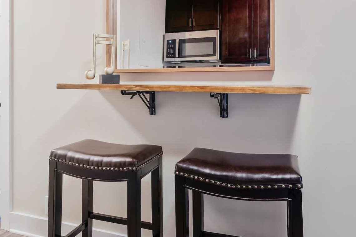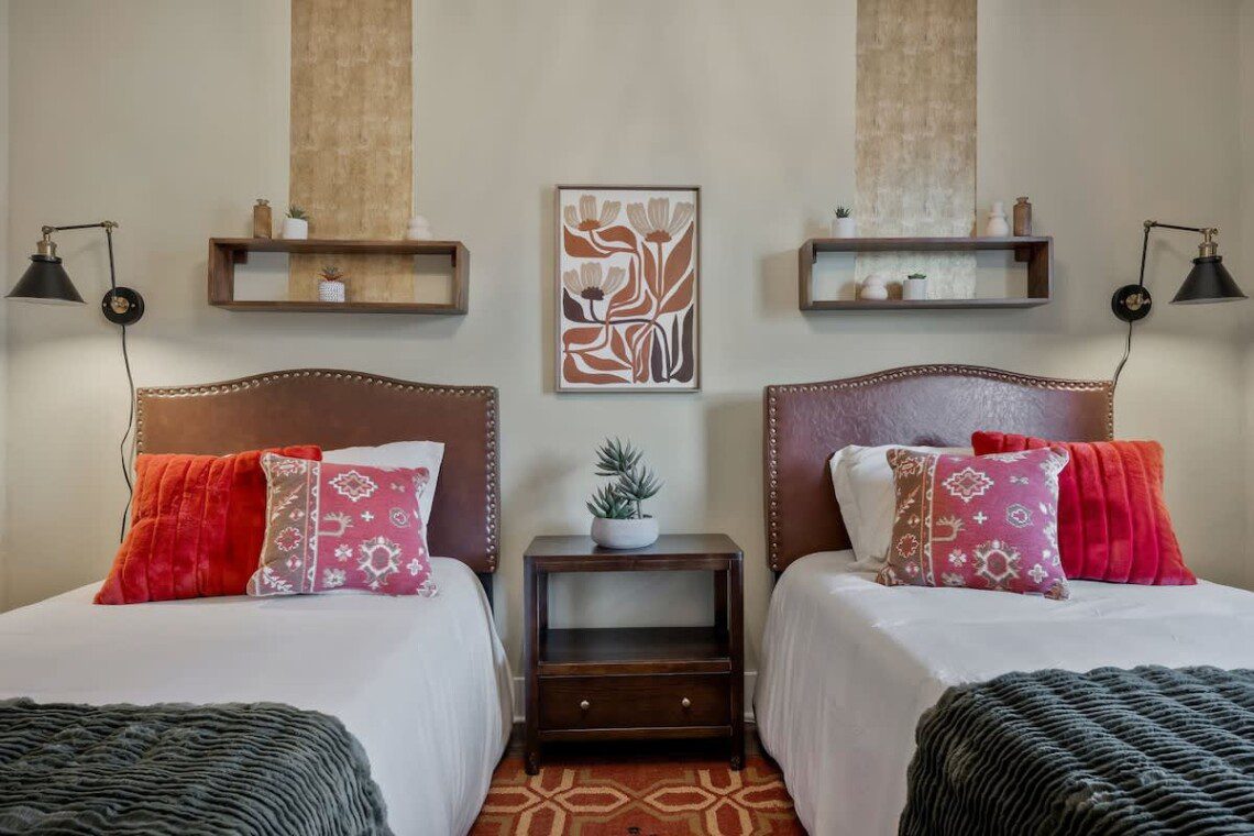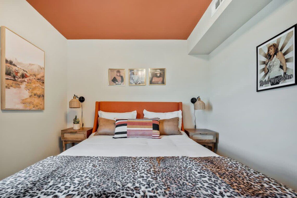 Welcome to our Reba McEntire – themed apartment. This two bedroom and one bathroom apartment, provides a trendy space to call home after exploring a day in the music city. The living room provides ample space to relax and stream your favorite shows on our mounted flat screen Smart TV. The sofa bed also pulls out into a queen sized bed, allowing for 6 guests to stay in this apartment.
