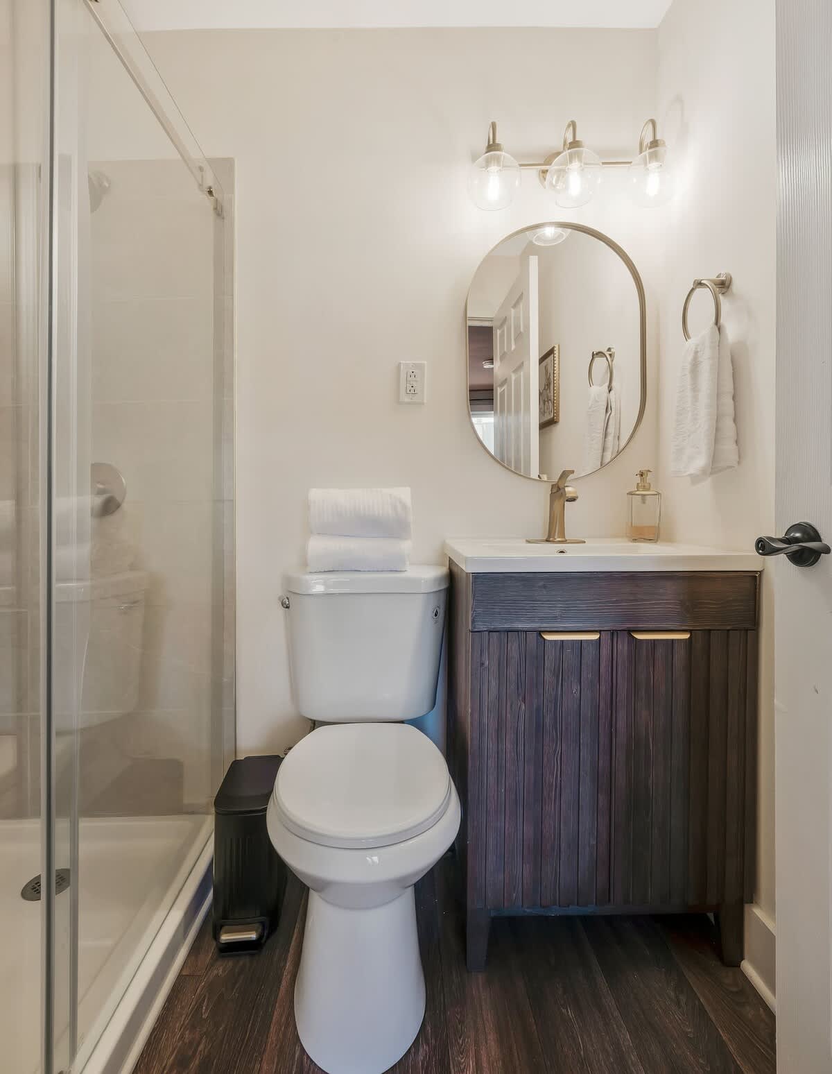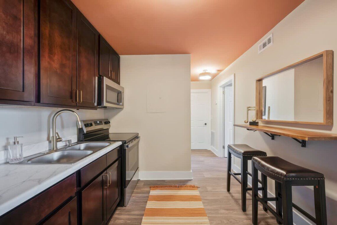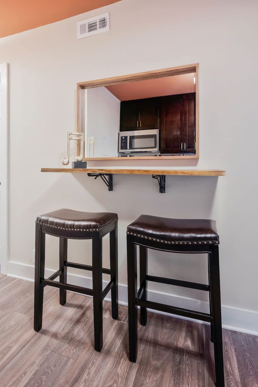 Welcome to our Reba McEntire – themed apartment. This two bedroom and one bathroom apartment, provides a trendy space to call home after exploring a day in the music city. The living room provides ample space to relax and stream your favorite shows on our mounted flat screen Smart TV. The sofa bed also pulls out into a queen sized bed, allowing for 6 guests to stay in this apartment.