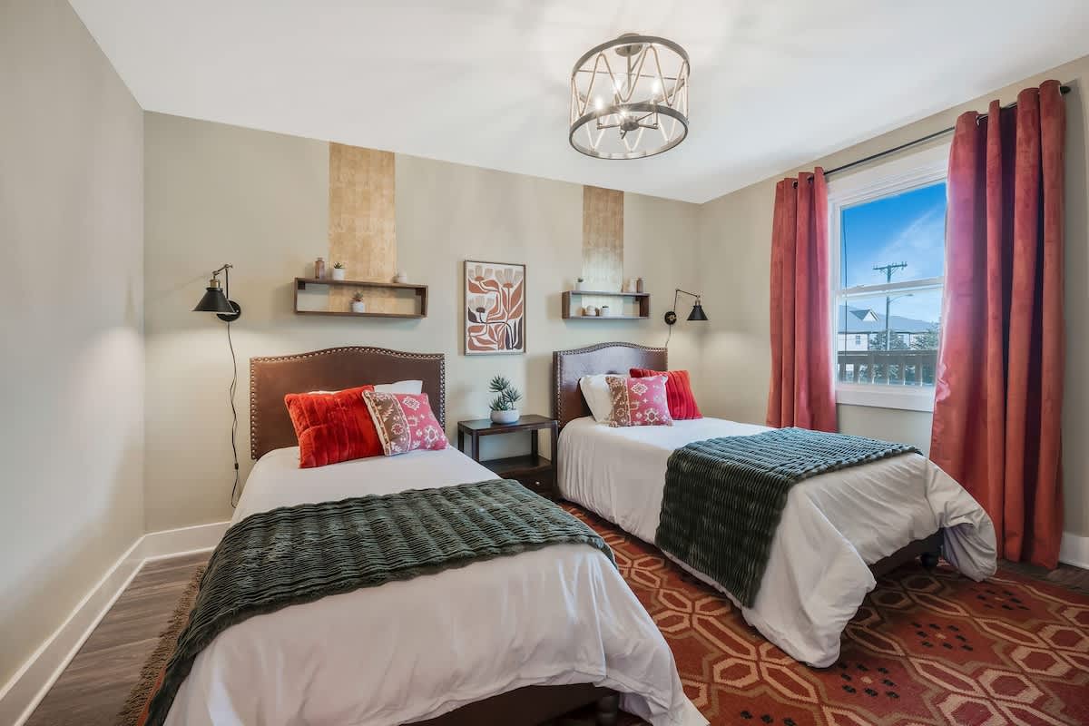 The kitchen contains all of the cooking essentials that you will need if you are looking to dine-inside this apartment as well as a brand new Keurig Coffee Machine. The first bedroom is equipped with a queen sized bed and thoughtful design touches throughout, to make you feel right at home during your stay. The second bedroom contains two single beds, to ensure your entire group has a comfortable place to rest their head at night.
