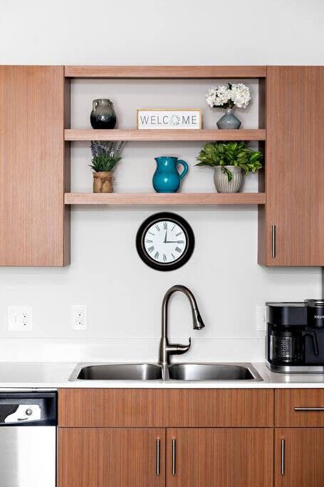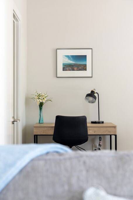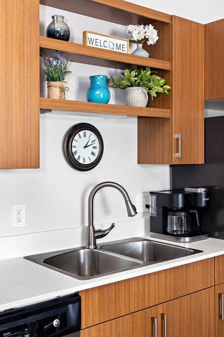 The guest bedroom has a queen bed and a walk-in closet to store your belongings. Don’t worry if you decide to extend your stay, this suite comes with their own washer and dryer along with basic laundry supplies.